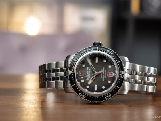 Kezdjük a mérettel. A tok titánból készült, 45 milliméteres, ami alapján hatalmasnak kéne lennie. Viszont kapott egy kiváló gumiszíjat, aminek formája követi a tok ívét, és a tokfülek végénél nyílegyenesen hajlik lefelé, aminek köszönhetően nincs „medúza” formája, szépen fekszik fel a csuklóra, anyagában pedig kellően puha, tehát 45 milliméteres létére kényelmes.