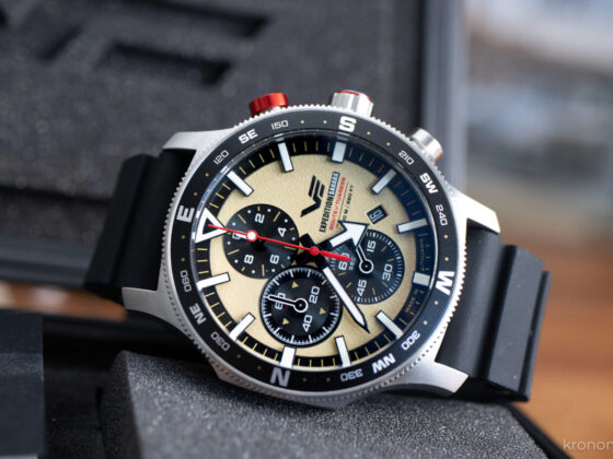 44 milliméter átmérőjű a tok és a buborék szerű magas kristálynak hála 19 milliméter magas, ami még mindig egy gofri vastagságával vékonyabb, mint a Rolex Deepsea Challenge. Itt van is mit nézni, hiszen olyan, mintha egy mechanikus akvárium lenne a csuklónkon, amiben óránként 18.000-szer ficánkolnak a „halak” egyenként. Magyarul, 2,5 Hz-en dolgozik a werk. Az alacsonyabb frekvencia által csökkent pontosságot visszahozza a különleges gátszerkezet. Legalábbis elméleti szinten ez a dupla billegő értelme, de gyakorlatilag senkit sem izgat mennyire pontos ez az óraipari alkotás.