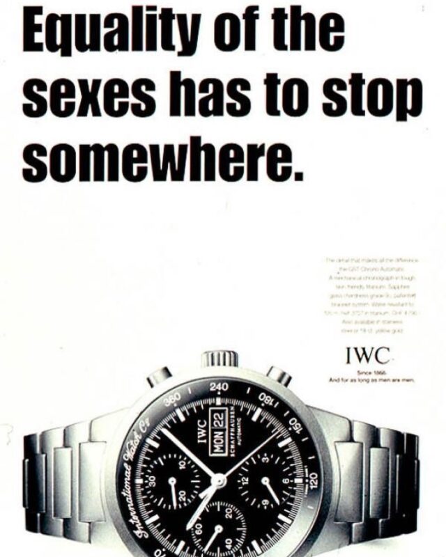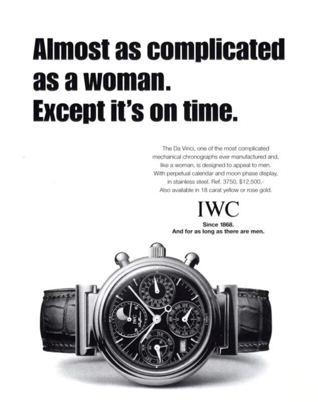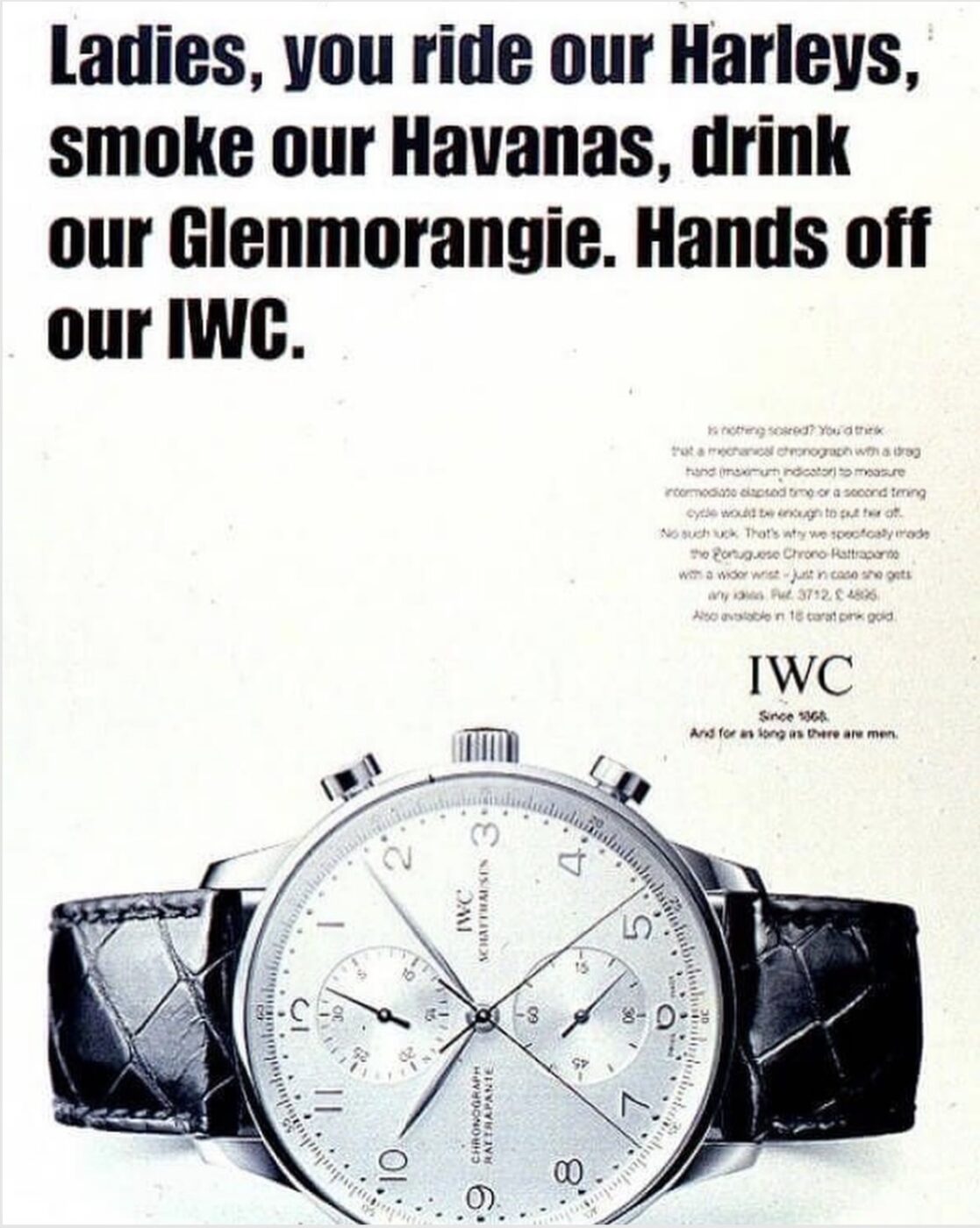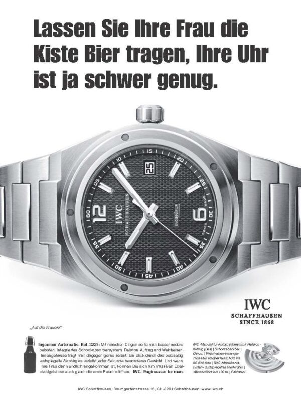 A kétezres évek elején a luxusóra piac talált egy új fontos célcsoportot – hívjuk „gyengébbik nem”-nek, hogy igazodjunk a cikkben ismertetett kommunikációs iránytól. Az IWC kampányai a nőket célzó kommunikáción is tudtak csavarni: a nőket, mint a „macsó férfiak játékterére” belépő, veszélyes vásárlókat szólították meg. Az (ál)macsó, humoros, sokszor önirónikus kommunikáció megmaradt a játékosság (na jó, a finomabb férfihumor) határain belül, ami szerencsére meg sem közelítette Mad Man éra valóban rosszul öregedő szexista headline-jait.