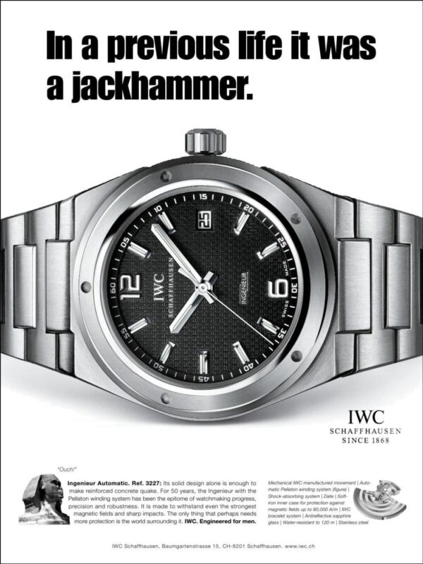 Az új Ingenieur Automatic (3227-01) bevezetését kísérő reklámok és marketinganyagok az óra méretét, súlyát és robusztus megjelenését emelték ki. Személyes kedvencem egy vaskos headline, amelyen ma is igazán jól esik őszintén röhögni: „Hagyja, hogy a felesége vigye a sörösládát, az Ön órája így is elég nehéz.”