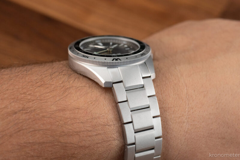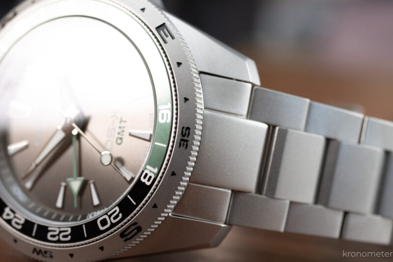 Az iránytű lünetta könnyen forgatható, szabadon, a GMT lünetta pedig nagyon finoman kattan. A szerkezet kvarc – ETA F06.865 – valódi GMT-s szerkezet, ami azt jelenti, hogy a korona első állásában óránként tudjuk állítani csak az óramutatót (tehát ha elutazunk egy másik időzónába, a perchez nem kell nyúlni, hanem egyedül az óramutatót állítjuk), és ha második állásba húzzuk, akkor mozog együtt az óra-, a perc-, és a 24 órás mutató.