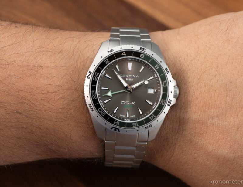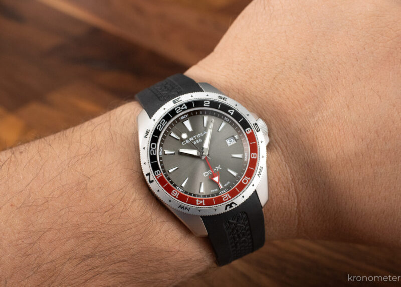 Sunburst-szürke és fehér számlapok közül lehet választani, nálunk a fehér nem járt a fotózás idején, de az a legvidámabb, a két szürke számlapos inkább monokrómabb hatást kelt. Az egyik fekete-piros, a másik fekete-szürke GMT lünettával érkezik, a fehér számlapos pedig kék-narancssárgával. Árazás szempontjából kifejezetten barátságosan lőtte be a Certina, a gumiszíjas 229.000 forint, az acélszíjas változatok 239.000 forintba kerülnek.