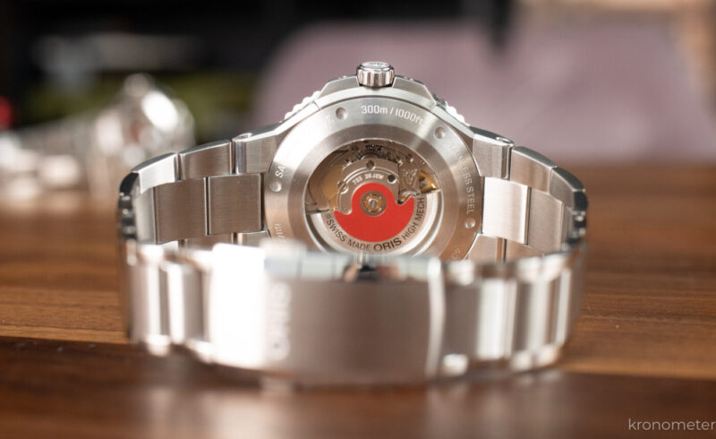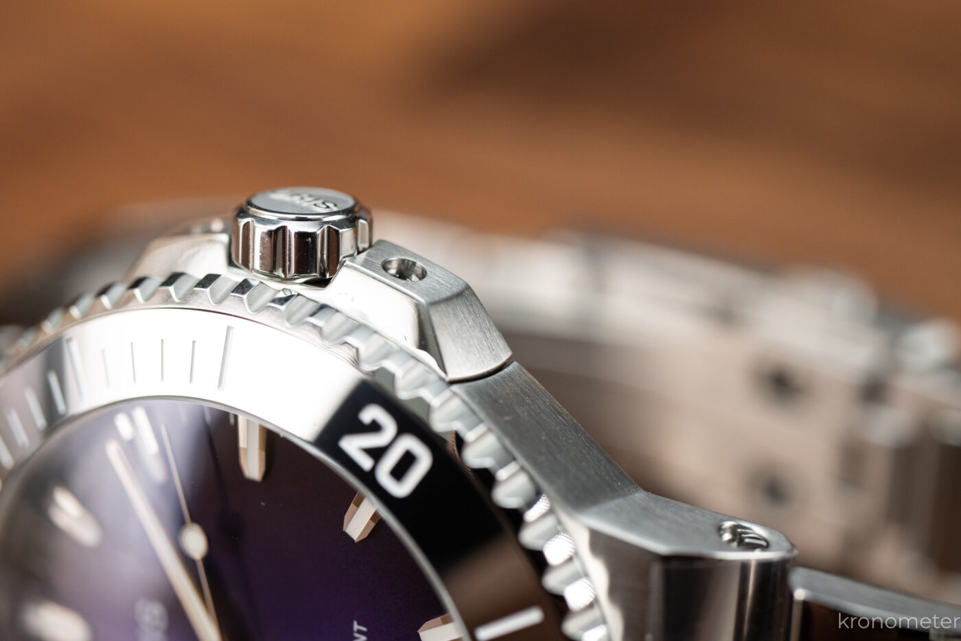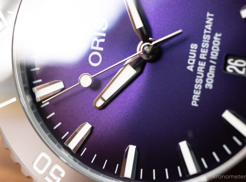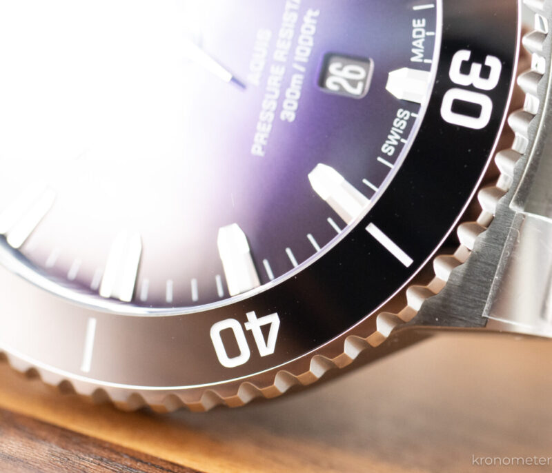 Az Aquis 43,5 milliméteres változatát már ismerjük, járt nálunk teszten itt a magazinban és a vlogban egyaránt. Masszív, de szépen ívelt tok, aránylag rövid tokfülek, 300 méteres vízállóság, kifejezetten egyedi koronavédő jellemzi. A lila számlapos modell esetében pedig volframból készült (volframkarbid) lünettabetétet kapunk, ami olyan, mint ha tükörpolírozott lenne, mégsincs változó fókuszpont, tehát nem változik, hogy élesen, vagy elmosódva látunk benne tükröződni bármit. Folyamatosan homályos, mégis ha a felületét nézzük, fényes.
