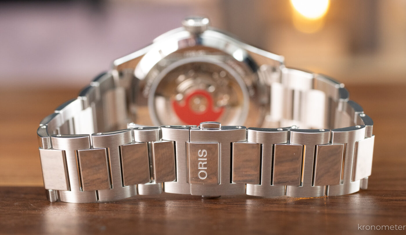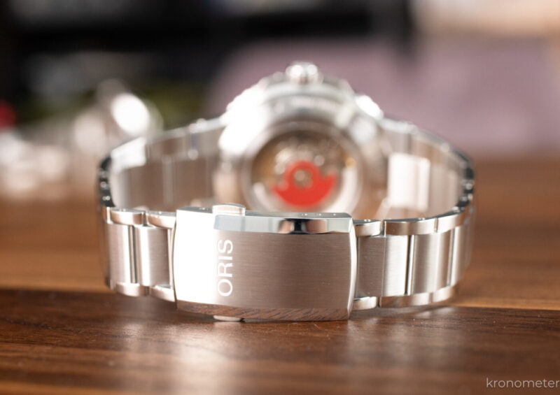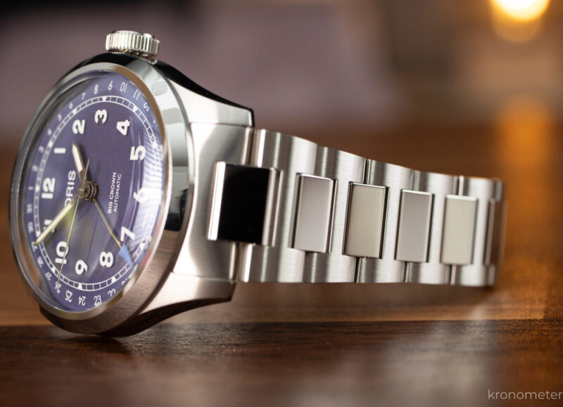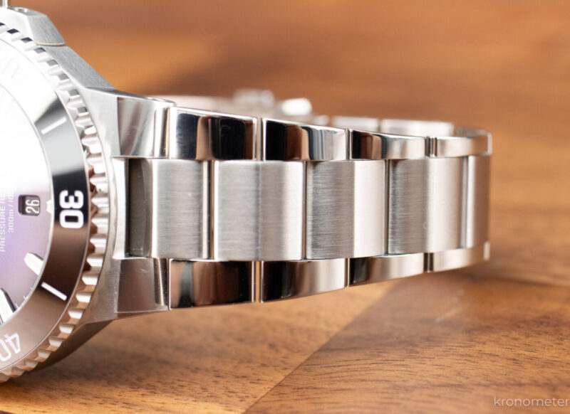 A fémszíj sem okoz csalódást. Integrált végszemes, így csak a gyártó által készített szíjakra tudunk cserélni, viszont amit kapunk az kényelmes és jó minőség. 3 szemes, oyster jellegű szíjszemek, viszont a felső részük nem sík, hanem van egy nagyobb ív benne, ezzel a formát, és a fényt is megtöri.