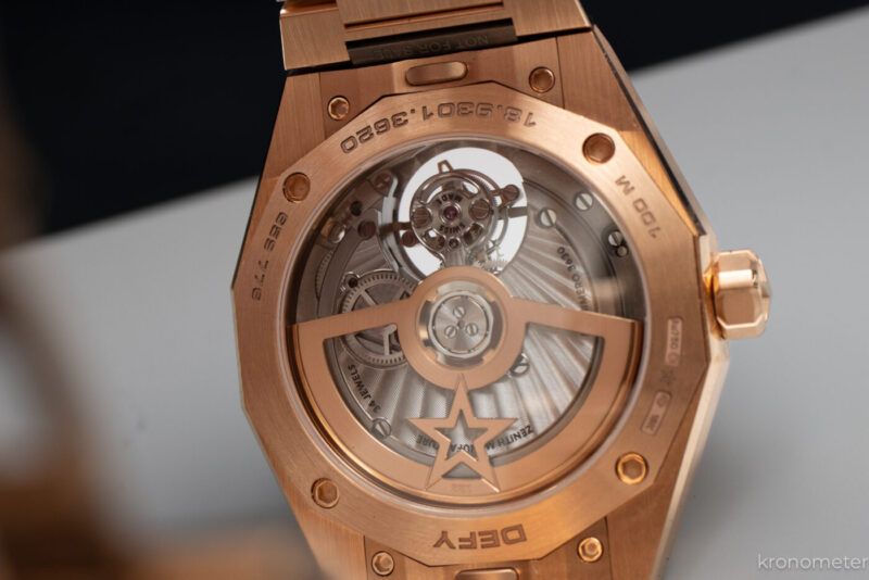 Az üvegbetétes hátlap mögött dolgozó El Primero 3630 szerkezet magas, 5 Hz-es frekvencián jár, ettől függetlenül a tourbillon továbbra is 60 másodperc alatt fordul egyet saját tengelye körül. 50 óra járástartalékot ígér. Díszítése a márkától megszokott modern, részletes kidolgozás.