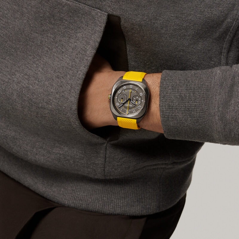 41 milliméter széles és 45 milliméter hosszú a karbon kompozit tok, ami könnyű és sok csuklón működik. Egy kis eleganciát visz a sportosság mellé a felül szálcsiszolt, letörésein polírozott, titán ráma, ami az átvezető alkatrészt jelenti a szögletes tok és a kerek zafírkristály között. 100 méterig vízálló, ami különösen jó, főleg, hogy monopusher kronográf lévén, a koronába integrálták a stopper gombját is. Ezzel az egyetlen gombbal vezérelhetjük a stopper funkciót. Mint a Naples Yellow kiadás számlapján, úgy a koronán is finoman, de észrevehetően jelenik meg az élénk citromsárga szín.