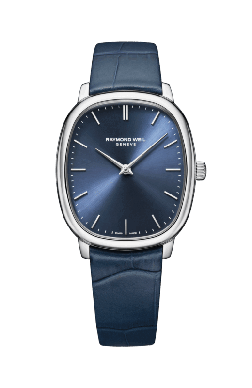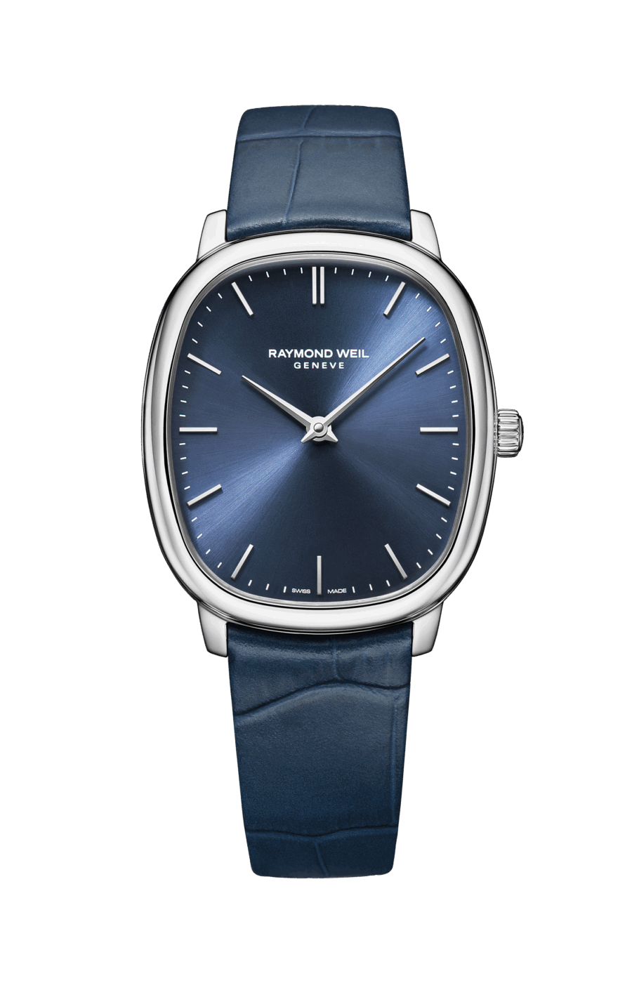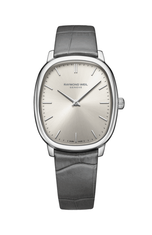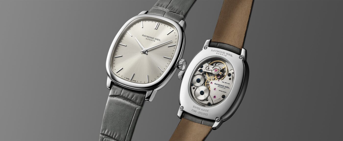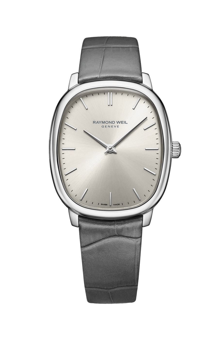 Egy elérhető árú, elegáns, mechanikus, ellipszis formájú óra a Raymond Weil-től.