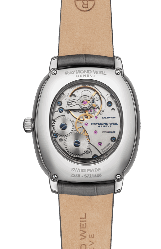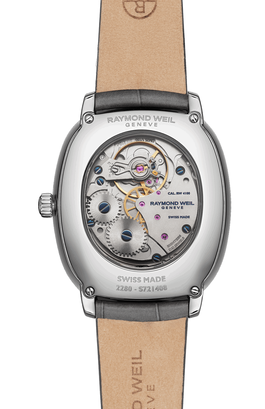 A zafírbetétes hátlapon át látszik a Raymond Weil RW4100 kézi-húzós szerkezet, ami egy átnevezett Sellita SW210-1. 45 óra járástartalékot biztosít 4 Hz-es frekvencia mellett. Egy alap kézi felhúzású svájci werk, egyszerű díszítéssel. Dicsérendő részlet, hogy ugyan a szerkezet kerek, a hátlap kivágása követi a tokformát, így úgy látszik, mintha a szerkezet is követné az óra formáját, akárcsak jóval drágább társain.