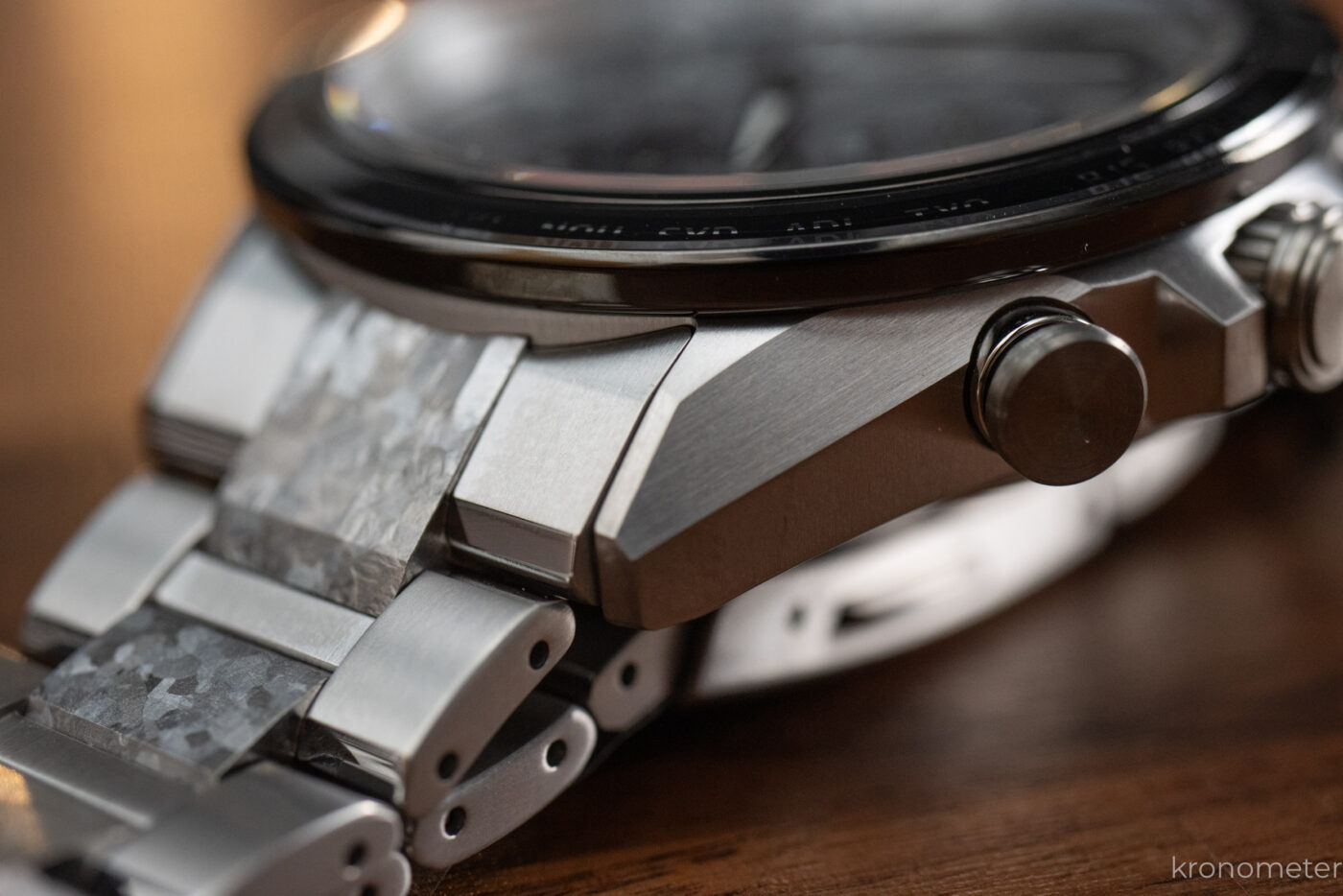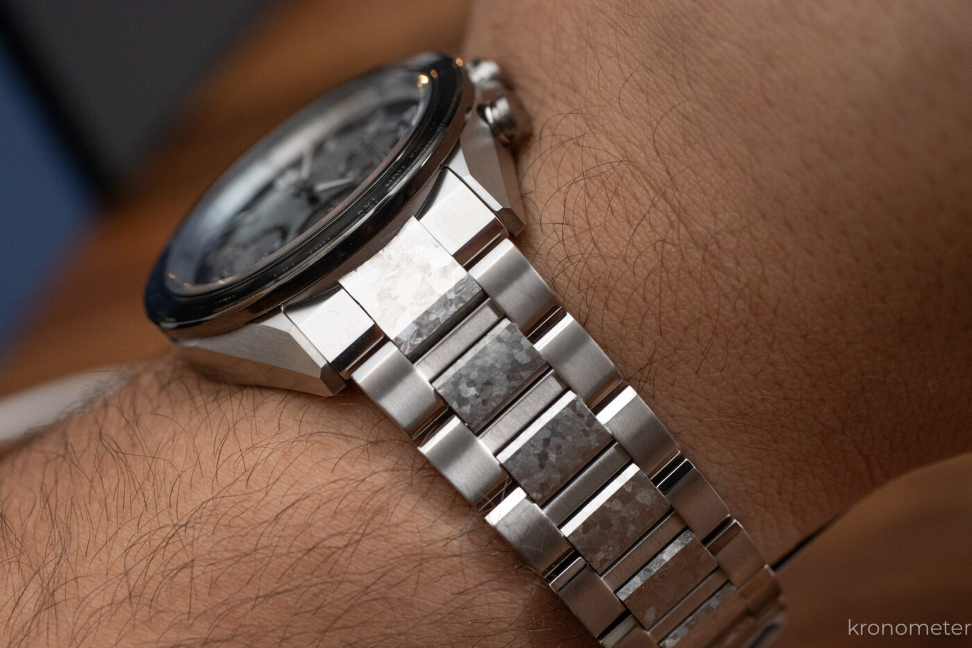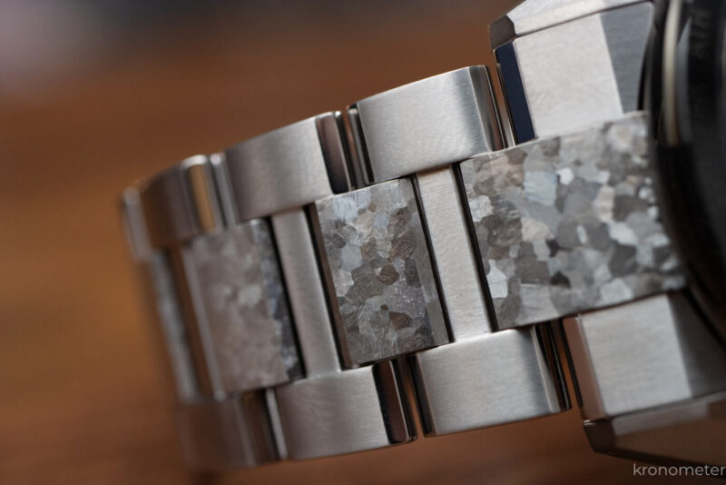 A számlap követi az újrakristályosított titán és a meredeken összefutó élek látványvilágát, itt viszont nincs varázslat, sem extra anyag, nyomtatásos eljárással készült, így kapta meg ezt az absztrakt mintát. A lünetta néhány szögből kerámiának tűnhet, pedig titán, DLC bevonattal. A szíj szemei viszik el abszolút a show-t, itt a leglátványosabb az újrakristályosított titán. A szemek két részből állnak, a H alakú szemeket középen köti össze a látványos textúrájú szem-rész, a szélső szemek felső éle pedig polírozott, hogy legalább a szíjhoz adjon némi plusz csillogást.