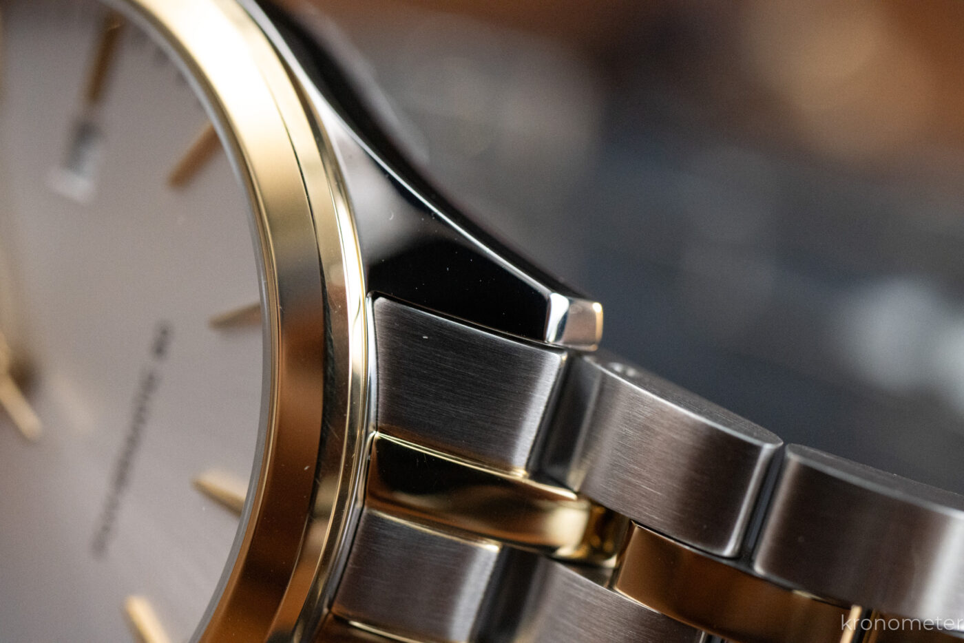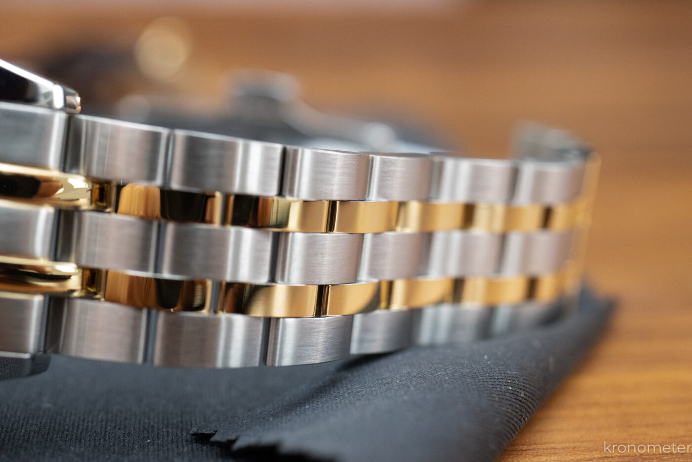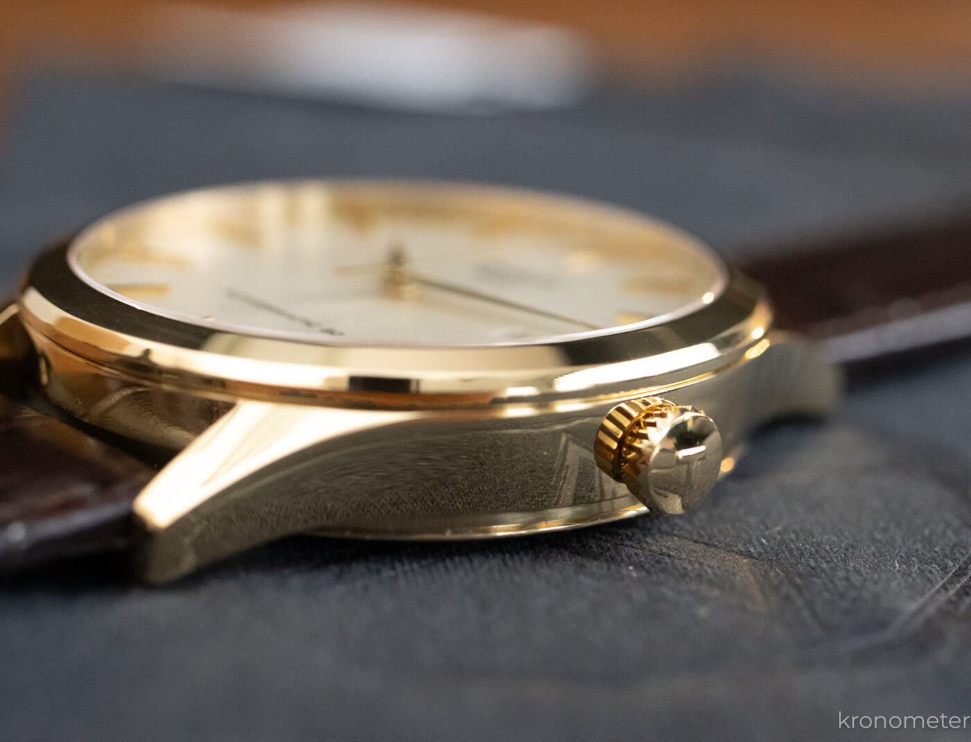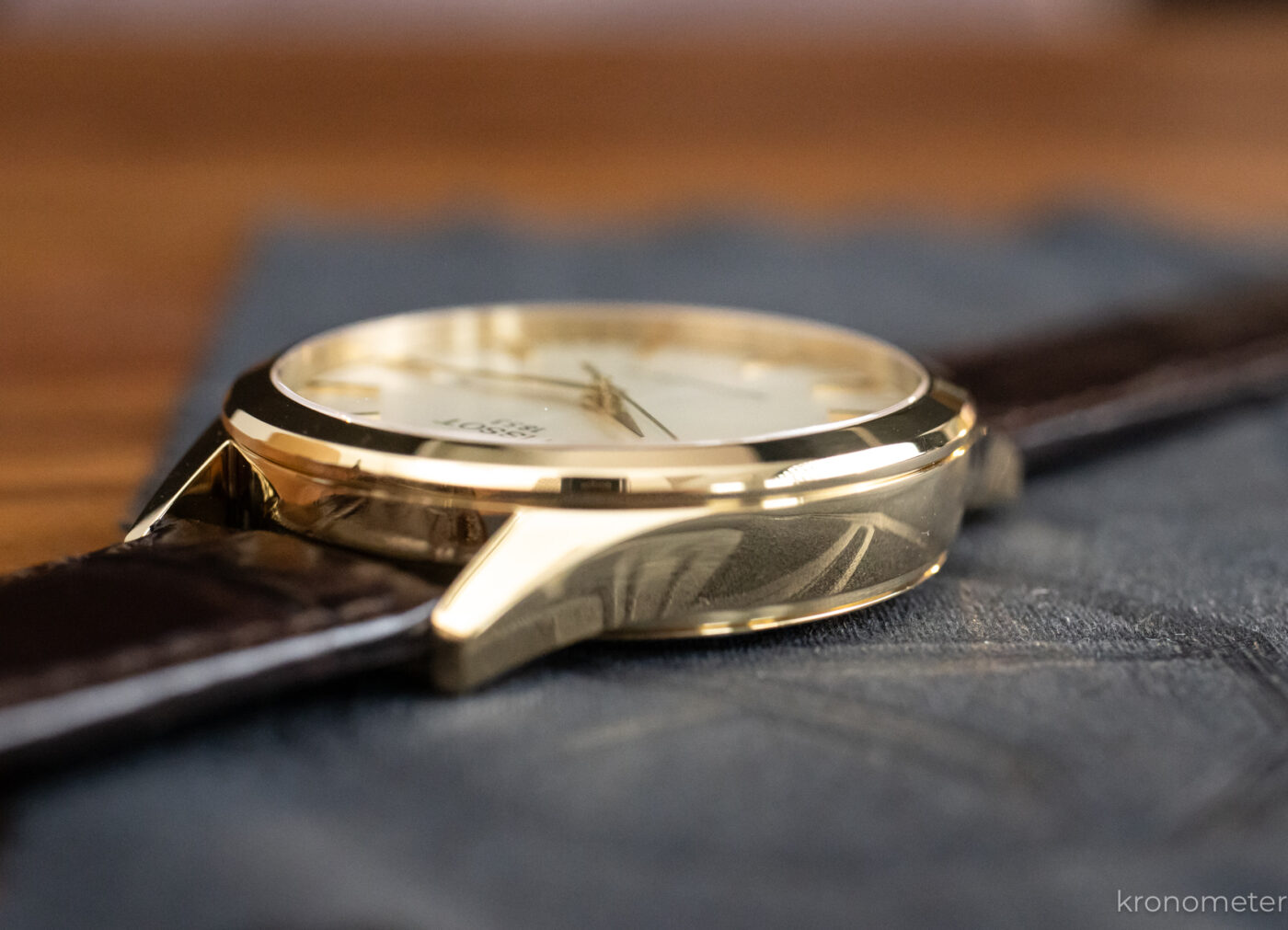 A 40 milliméteres acél tok arany színű PVD bevonatot kapott, ami jócskán az elegáns vonal felé húzza a Classic Dream-et. Előnyére válik viszont, hogy a tok oldala olyan tisztességes felületkezelést kapott, hogy akárhogy forgatva az órát nagyon szépen tükröződünk vissza az oldalán, nem egy eltorzult tükörképet látunk egy elnagyoltan polírozott felületen, mint a Panerai-nál mint sok, ennél lényegesen drágább óránál szoktunk. Érdekes még, hogy 10,23 milliméter a vastagság, tehát sikerült megfelelő vékonyra faragni a tokot.