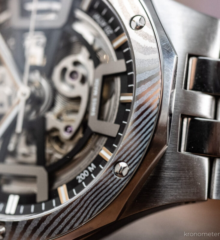 Damaszkuszi, kovácsolt acélból készült az óra rámája, ami minden egyes darabon másképp fest és másképp játszik a fényben. A damaszkuszi acél nem egy konkrét ötvözet, hanem egy bizonyos eljárással készített fémet jelent. Eltérő széntartalmú acél lemezeket helyeznek egymásra, amik hevítés mellett, irdatlan nyomás alatt összeforrnak. Ezt az újonnan létrejött elemet hajtogatják, hevítik és préselik, addig amíg el nem érik a kívánt mintát és erősséget.