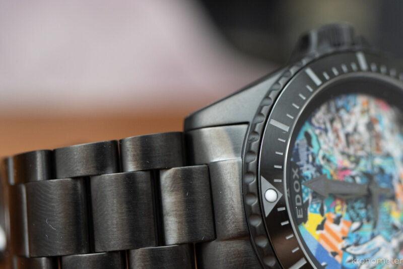 Meglepően kivehetők a fekete mutatók, amikbe a hagyományos fehér helyett sötétszürke Super-LumiNova foszforeszkáló festék került. 12 óránál egy diszkrét Edox feliratot találunk, amit egy szintén igényesen elhelyezett, gravírozott Edox homokóra logó egészít ki a számlap körüli, arra merőleges gyűrűn. 300 méteres vízállóságáról a menetes koronazár és a masszív, 3 milliméter vastag zafírkristály gondoskodik, de még így is elég karcsú a mindössze 12,3 milliméter vastag tokprofil.