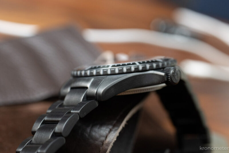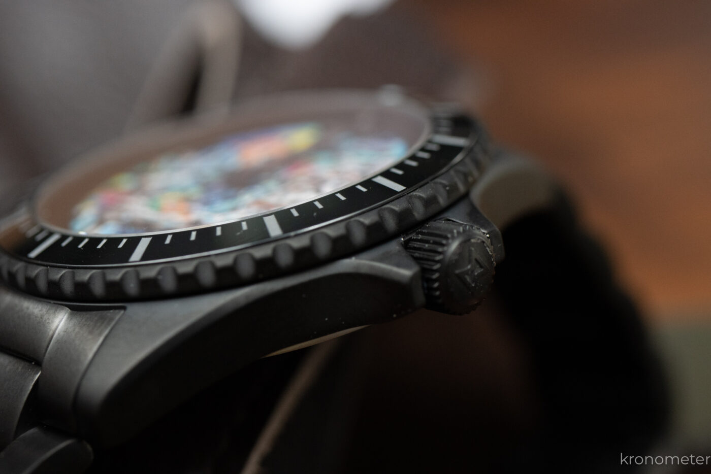 Mindezt egy klasszikus Edox Neptunian búváróra veszi körbe, 42 milliméteres átmérővel, minden porcikáján matt fekete PVD bevonattal. A fényes fekete kerámia lünettabetét szolgál átmenetként a matt acél és az élénk számlap között.