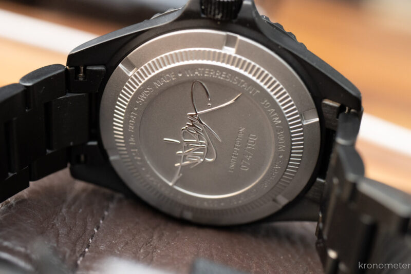 Jo Di Bona aláírása és az adott óra sorozatszáma díszíti a tömör hátlapot, ami mögött egy Caliber 80-re nevezett Sellita SW 200 automata szerkezet dolgozik. 4 Hz-es frekvencia mellett ennek a werknek ez a legújabb változata már 68 óra járástartalékot ígér, ami komoly ugrás a régi 42 óra után.
