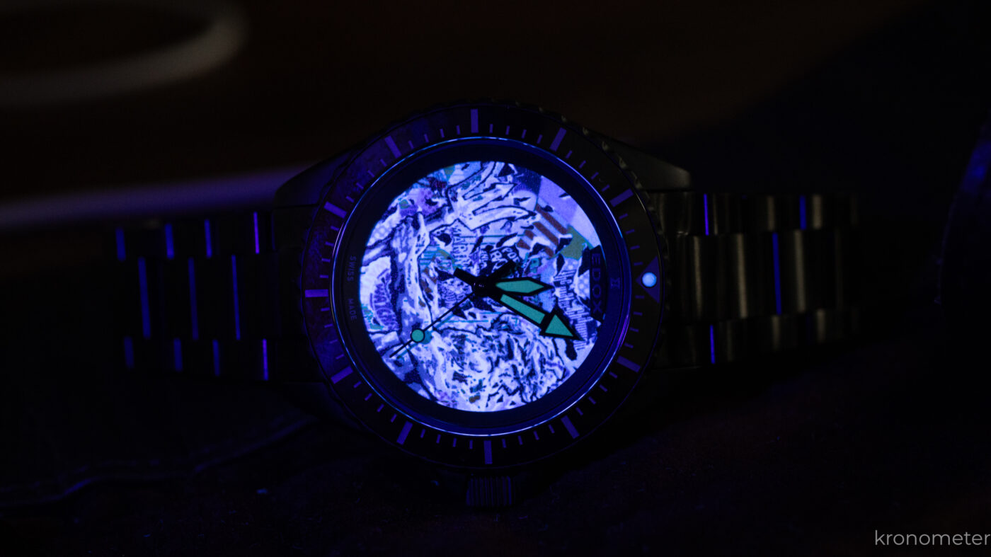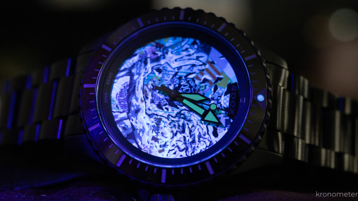 A számlap egy sajtolási technikával készül, ami megőrzi az eredeti kép rétegeit. A művész több klasszikus festészeti technikát ötvözött képregényekből és régi Edox plakátokból kitépett papírdarabokkal, hogy létrehozott egy élénk, kaotikus környezetet Neptunusz képmása köré.