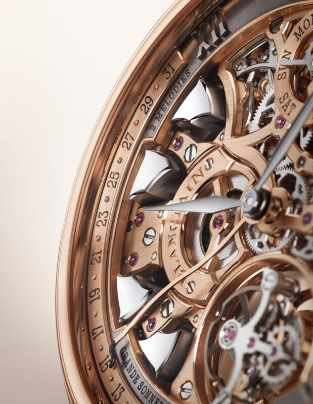 Szerkezetileg két különálló fogasléccel oldották meg a két dallam eljátszását, amelyek között egy, a stopperes órákban is használt oszlopkerék vált. Négy gong üti el a pontos időt és ezek mozgásának kombinációi adnak 16 önálló hangot, amiből összeállnak a dallamok. Az óraüveg alatt közvetlenül találjuk az arany ívet, amit a gongok ütnek, így annak hangját nem nyeli el túlságosan a tok, sőt az egész óra egy nagyon „hangszóró”. Minden egyes hang létrehozásához elképesztően precíz műszaki és zenei számítások kellenek.