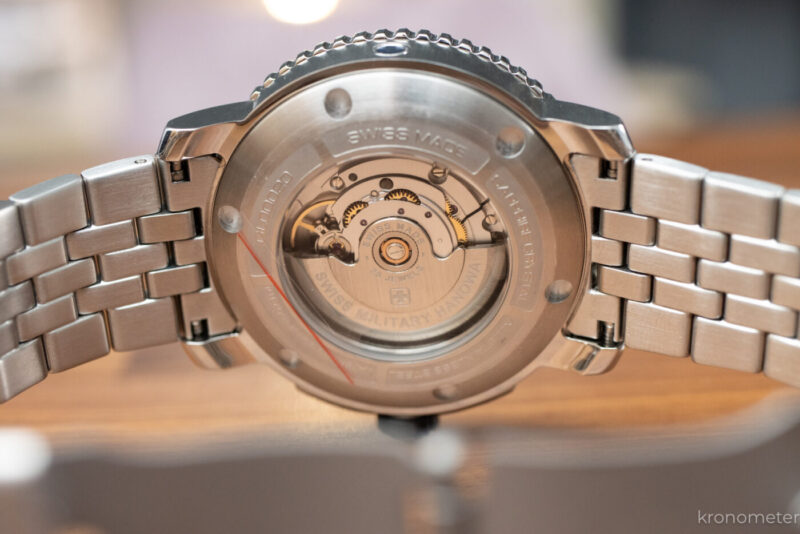 Üvegbetétes hátlappal érkezik az automata verzió, ami alatt a svájci Soprod P024 automata szerkezet dolgozik. Ez is a legendás ETA 2824 alapjaira épít, mint sok más beszállítói szerkezet, így 4 Hz-es frekvencia mellett 38 óra járástartalékot kínál.