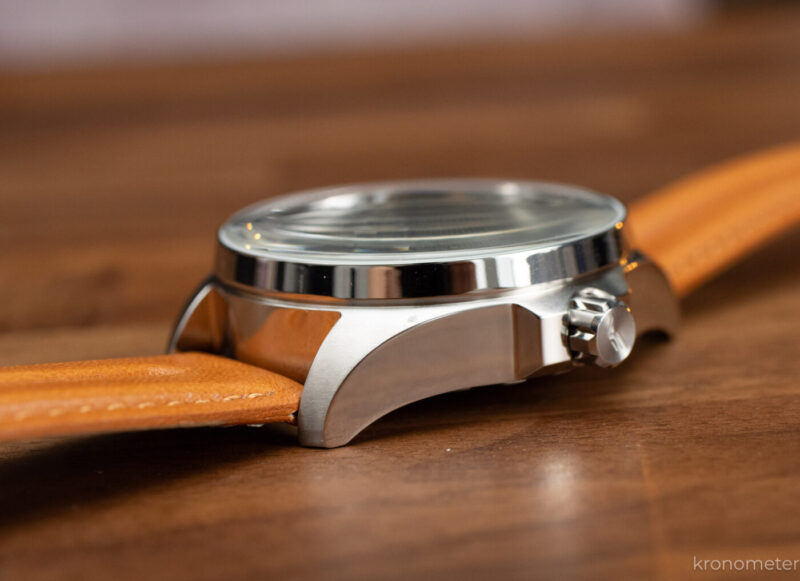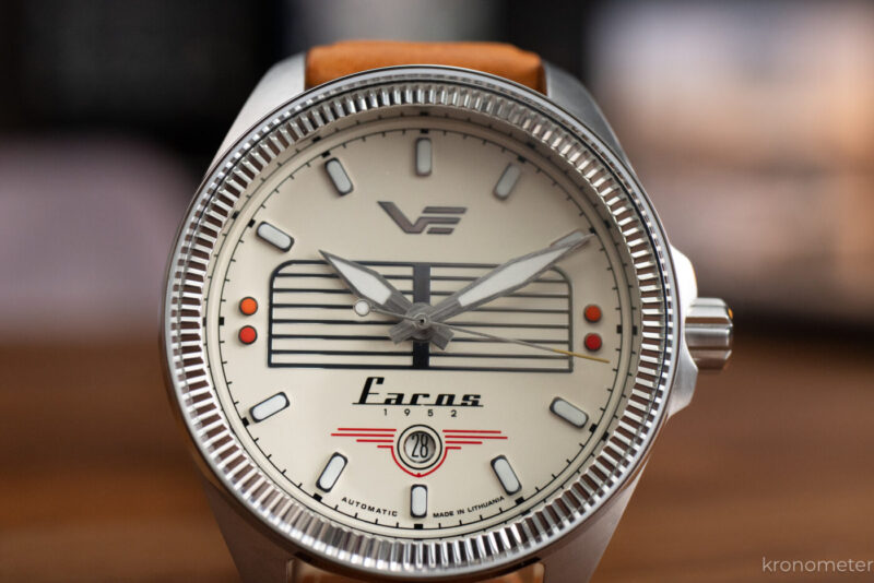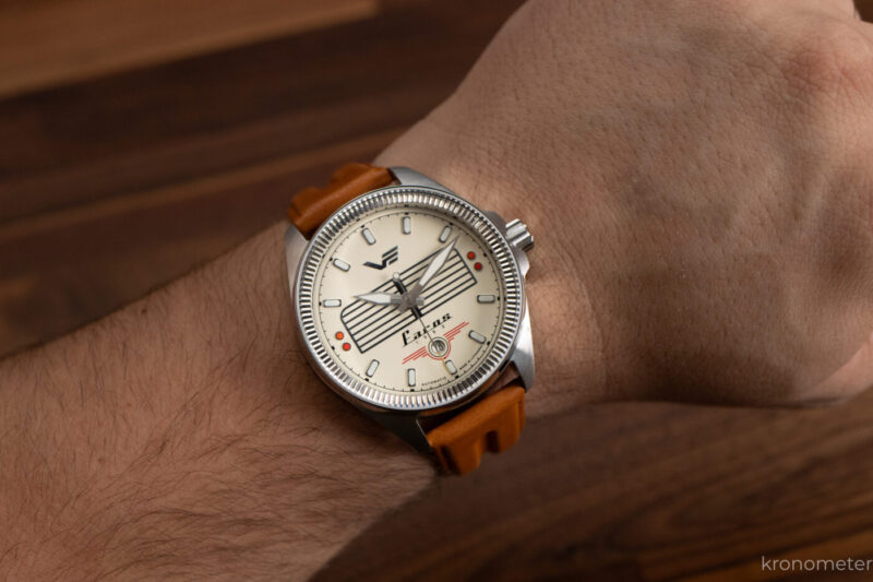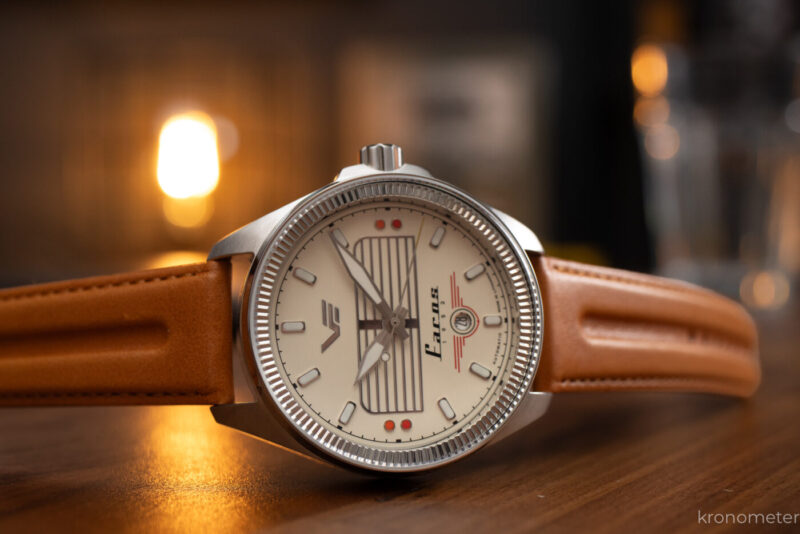 A számlap is vintage hatást kelt bézs alapjával és egyszerű jelöléseivel. Nem a márkától megszokott toolwatch irányt követi, méginkább kihangsúlyozva, hogy ez egy különkiadás. Foszforeszkáló festék került az applikált órajelölőkre és a mutatókra, így nem vesztett a márkától megszokott funkcionalitásból az óra.