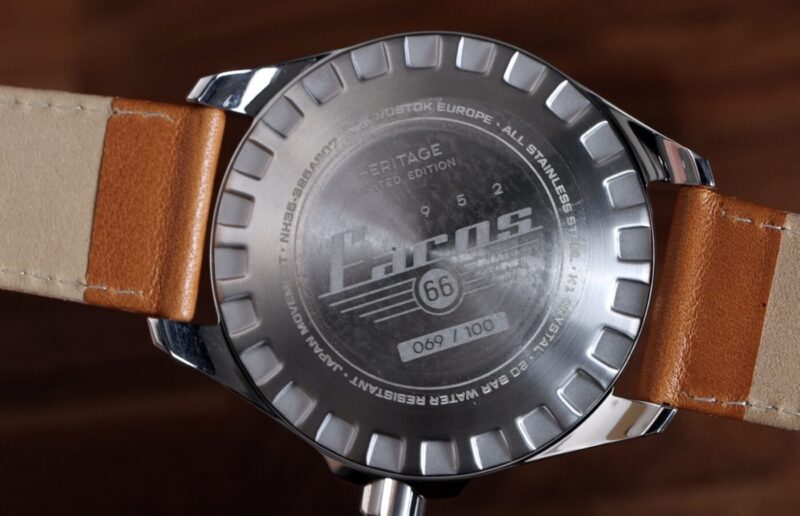 Az óra tömör hátlapjára gravírozott Faros 66 felirat és a konkrét óra sorszáma került, a szokásos információk mellett. Alatta egy jól bevált Seiko NH35 automata szerkezet dolgozik 3Hz-es frekvencián 41 óra járástartalékkal.