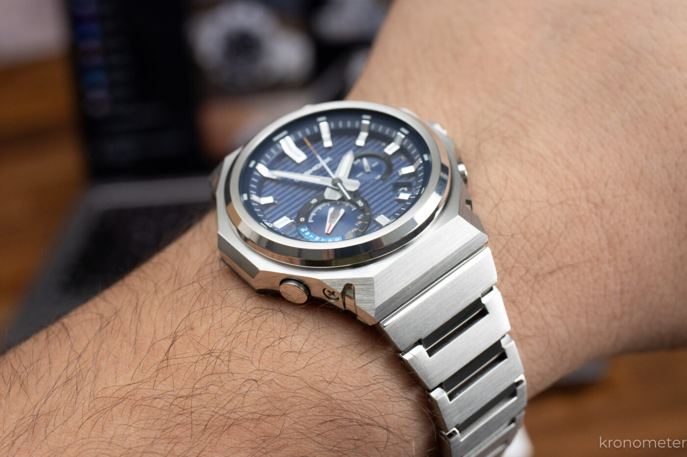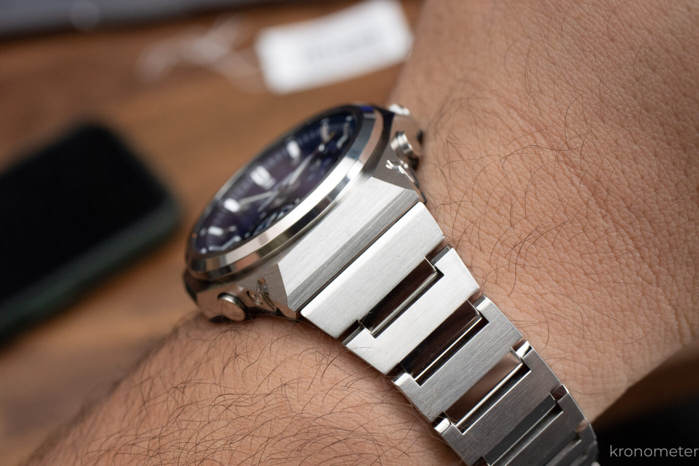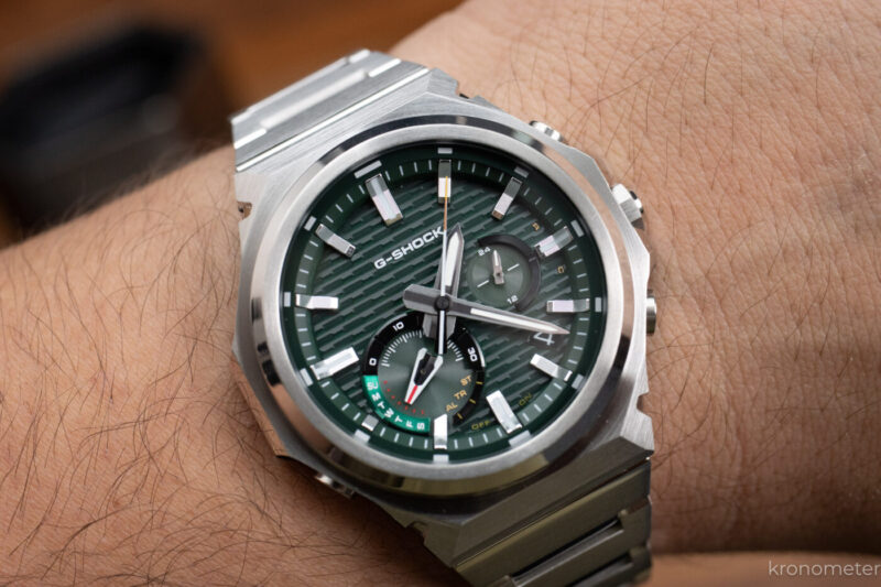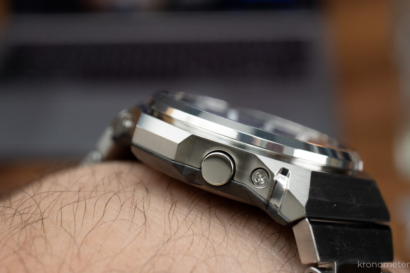 Több pontján is éles szögekben futnak össze a nagyrészt szálcsiszolt felület síkjai, jellegzetes, japán órás összképet hozva. Mint a legtöbb acél G-Shock, úgy ez is szénszálas kompozit magra épít, amit körülvesz az acél külső, így megmarad a G-Shock órák híres ütésállósága, amit ezúttal uretán ütéselnyelő elemekkel is megerősítettek. Ennek ellenére az óra profilja kifejezetten karcsú, ami nem minden korábbi G-Steel óráról volt elmondható. Kézzel tapintható a fejlődés.