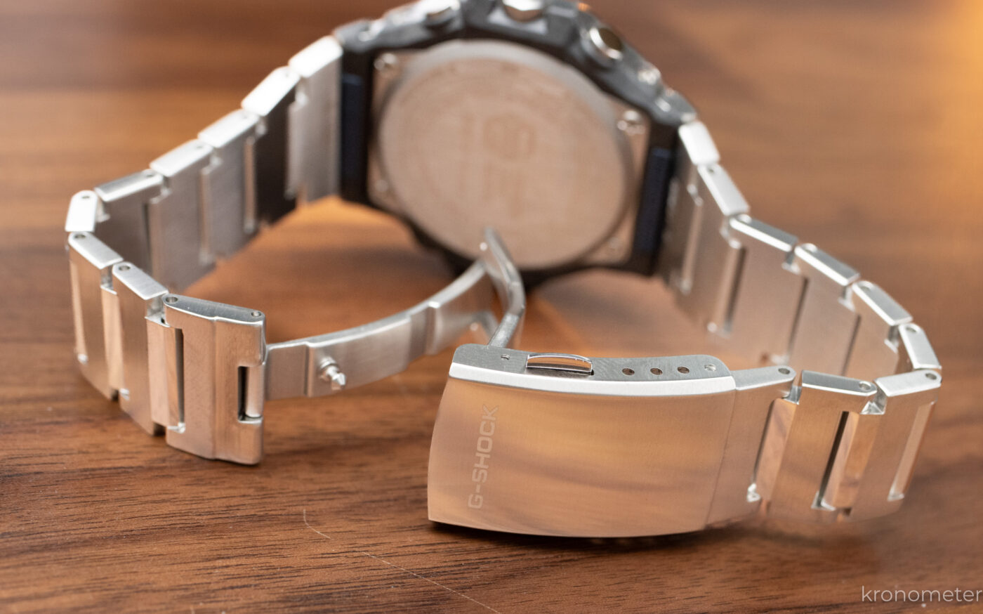 Egy egészen új acél csatot kapott a GST-B1000, ami tökéletesen követi a tok formavilágát. Szálcsiszolt és polírozott elemei változatossá teszik. Kissé nagy toleranciák vannak a szemek között, de felvéve szépen követik a csukló formáját. Tömör, esztergált zár tartja kezünkön az órát.
