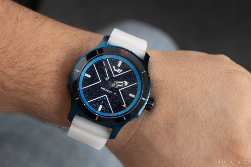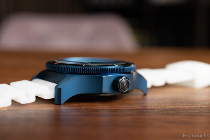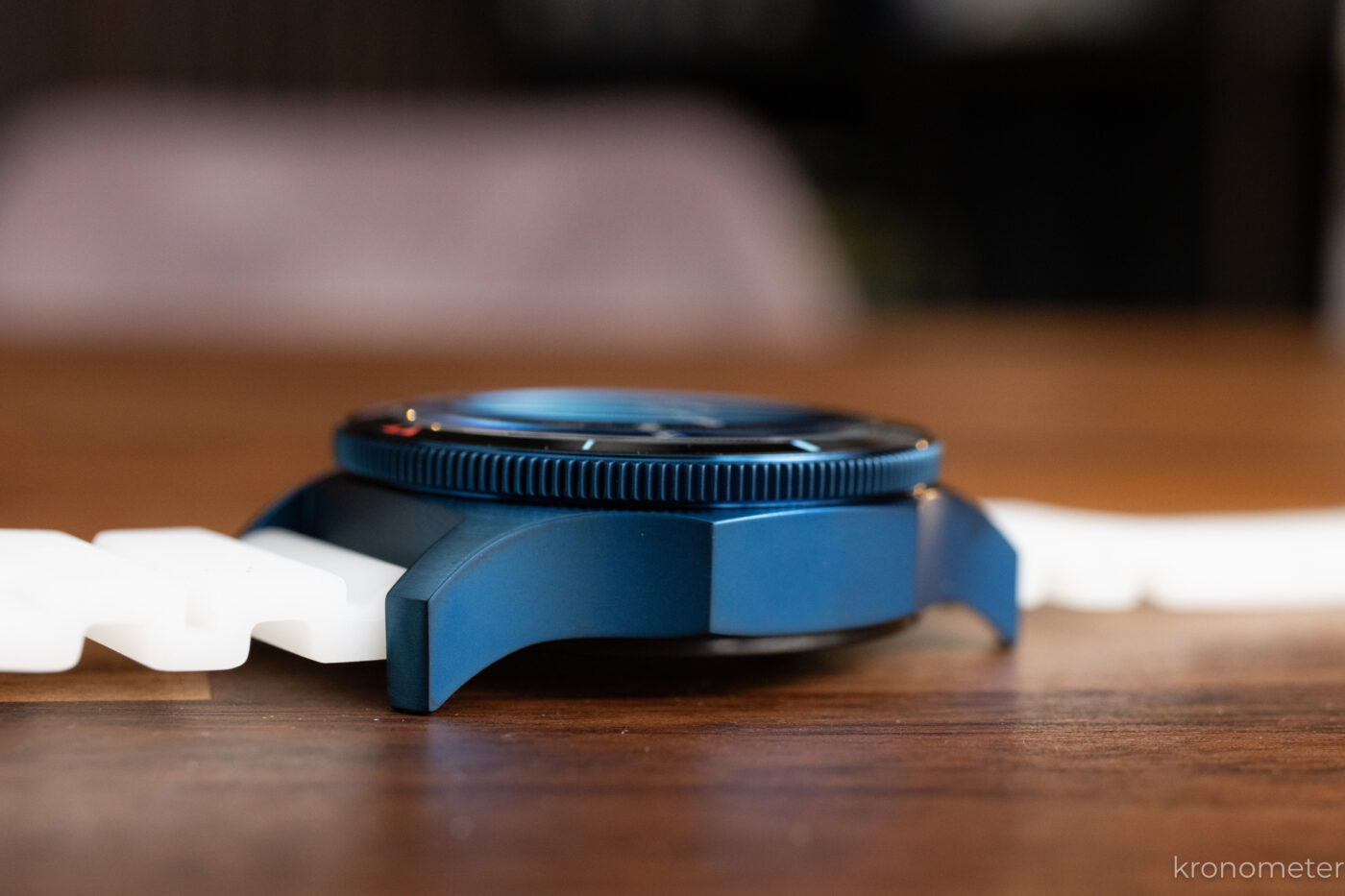 A kékre PVD-zett acél tok nem egy visszahúzódó darab. A tokfülek hosszúak, de a gumiszíj egyből körbefogja a csuklót. Nem azt mondom, hogy 16-17 centis csuklón is jól fog állni, mert szinte biztos, hogy nem, de egy közepes vastagású 18 centis csuklón már teljes természetességgel viselhető. Ingujj alá nem fog beférni, akárhogy próbáljuk, de ennek nem is célja.