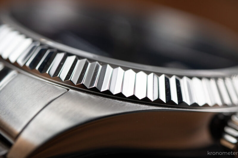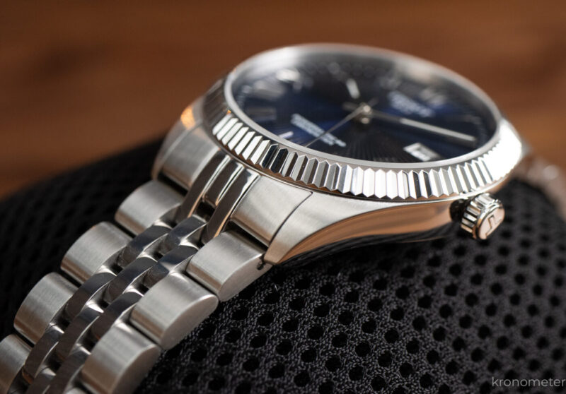 Ha már pont arról van szó, mi az ami előnyére válik, az a számlap. A mélyen texturált, már-már sunburst irányban barázdált számlap nagyon látványos, ha pedig forgatni kezdjük a fényben, láthatjuk, hogy tényleg minden szögben máshogy töri, és a jégkéktől a nagyon sötét kékig fedezhetjük fel az árnyalatokat. A római számos indexek megmaradhatnak ízlés kérdésének. Alapvetően nincs a római sázmokkal bajom, itt talán egy picit zsúfolttá teszi a számlapot és a pálcika indexek jobban álnának, de ez spekuláció. Látni kéne mindkettőt. Mindenesetre a polírozott, rakott római számok tükröződnek is, így kapunk még egy egységnyi csillogást.