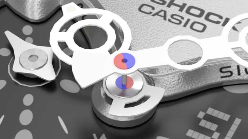 Ami viszont különleges, és új jellegzetesség, az a mágneses mutatók. Ennek kifejezetten akkor van haszna, amikor leejtjük az órát, vagy bármilyen egyéb ütés, behatás éri, és ahelyett, hogy a mutatók – is – elnyelnék a rájuk eső energiát, a tengelyük mágneses, és ahogy az ütés hatására elmozdul, az ellentétes pólushoz érve vissza is kerül a kiindulási pontba. Így viszont a percmutatónak van helye és lehetősége kimozogni az ütődés közben fellépő hatásokat, ami valóban egy nagyon okos megoldás.