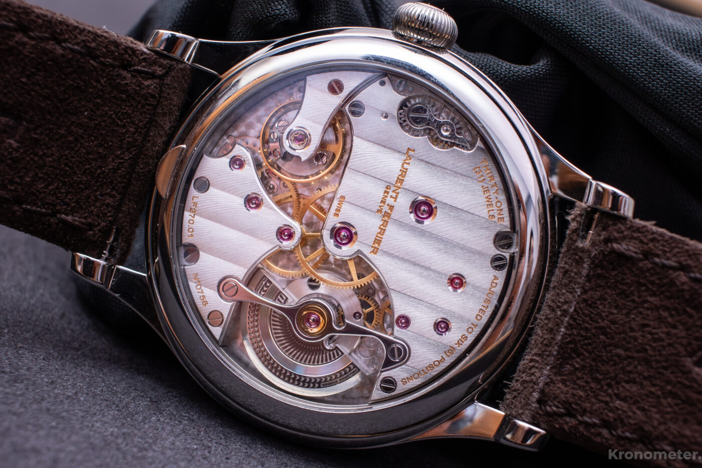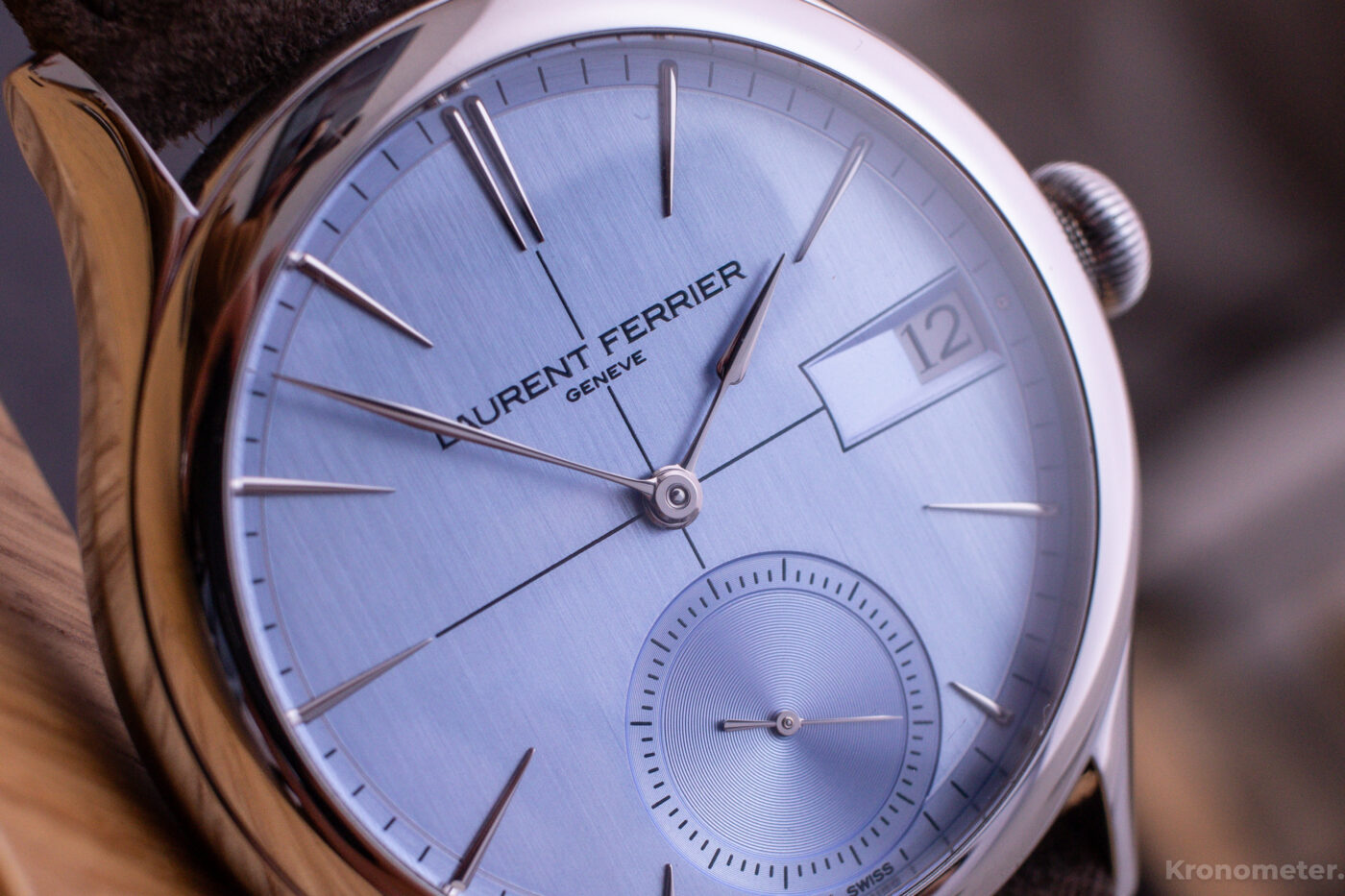 6 óránál egy nagyméretű kismásodpercmutatót találunk, két peremmel, nyomtatott skálával és körkörös textúrával. 3 óránál a Laurent Ferrier jellegzetes megoldásával oldják a dátumablak kontrasztját: egy hosszú, döntött rámpa vezeti a szemünket a fehér alapon fekete dátumkijelzésre.