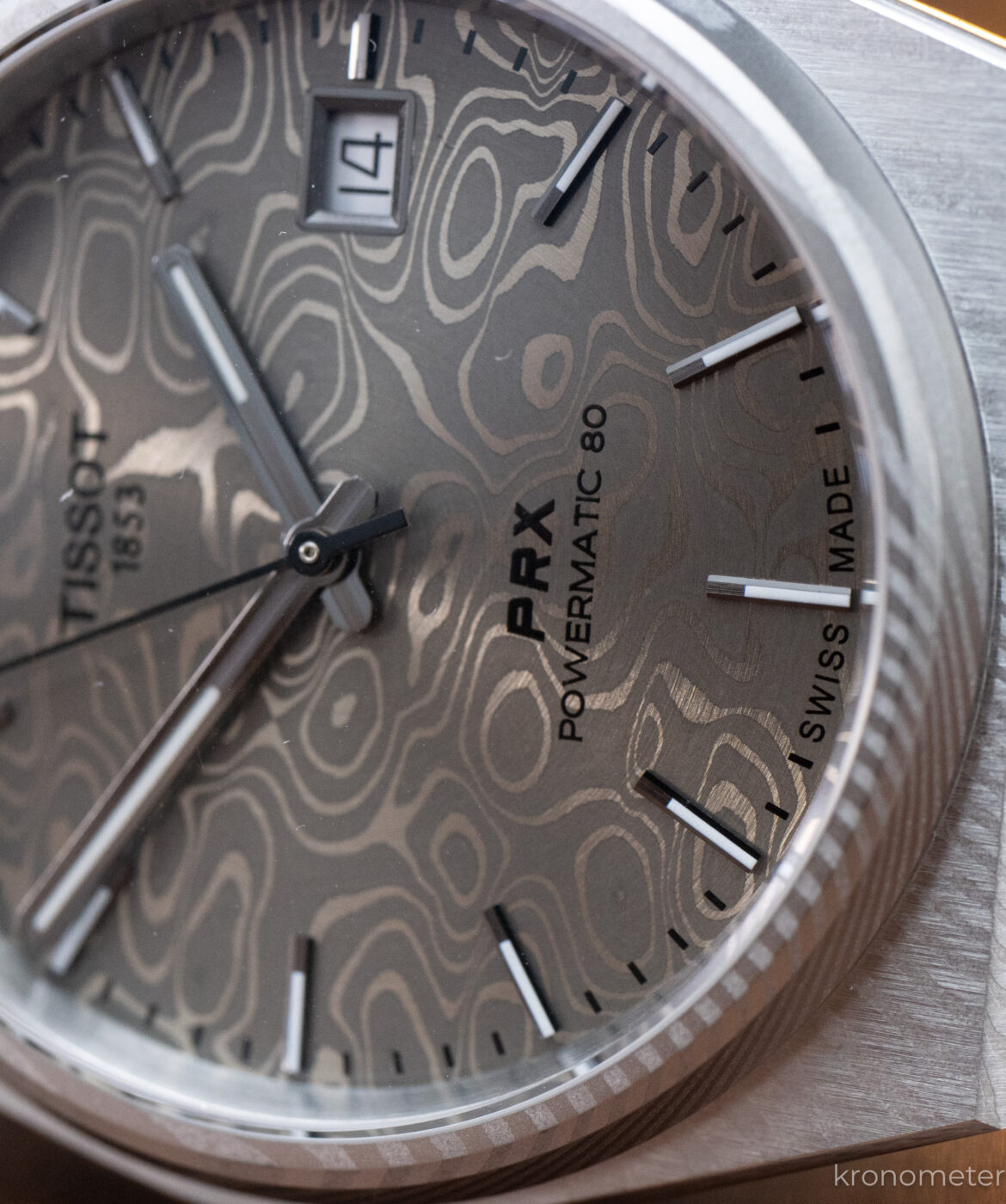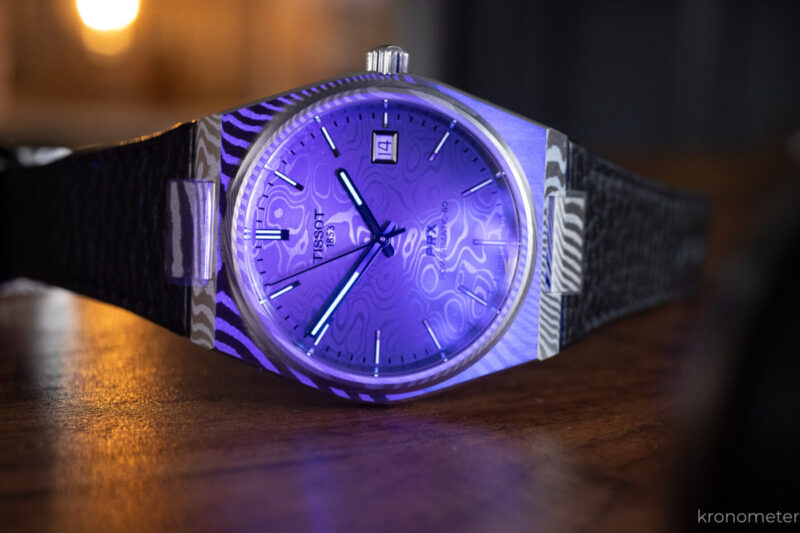 A legnagyobb dobás kétségkívül a damaszk acél változat. A Tissot itt nem a hagyományos, kovácsüllőn hajtogatott módszert választotta – ami ebben a mennyiségben és árkategóriában kivitelezhetetlen lenne –, hanem egy modern, porkohászati eljárást alkalmaz. Két különböző összetételű rozsdamentes acélport rétegeznek egymásra (összesen mintegy 70 rétegben), majd magas hőmérsékleten és nyomáson egyetlen tömbbé olvasztják őket. Ezt a tömböt munkálják meg, végül savas maratással hívják elő a jellegzetes mintázatot. Az eredmény tehát nem egy felületi nyomat, hanem az anyag szerkezetéből fakadó, mélységgel rendelkező textúra.