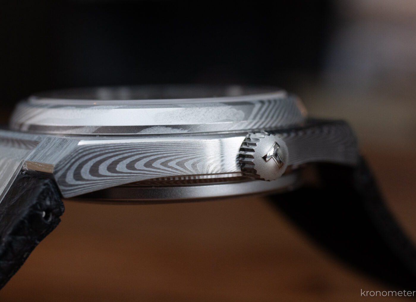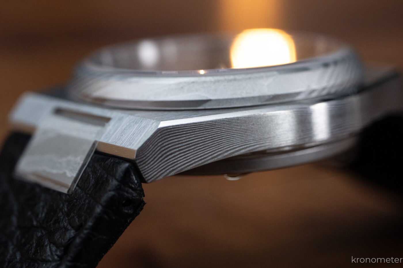 Ami igazán különlegessé teszi ezt a modellt, az a vizuális egység: a számlap ugyanabból a damaszk tömbből készül, mint a tok, így a jellegzetes, örvénylő mintázat megszakítás nélkül folytatódik az óra frontján is. Ez az „egyből faragott” hatás brutálisan erős indusztriális karaktert ad az órának. Nagyon bölcs döntés volt a gyár részéről, hogy ezt a modellt nem fémcsattal, hanem egy minőségi bőrszíjjal szerelték.