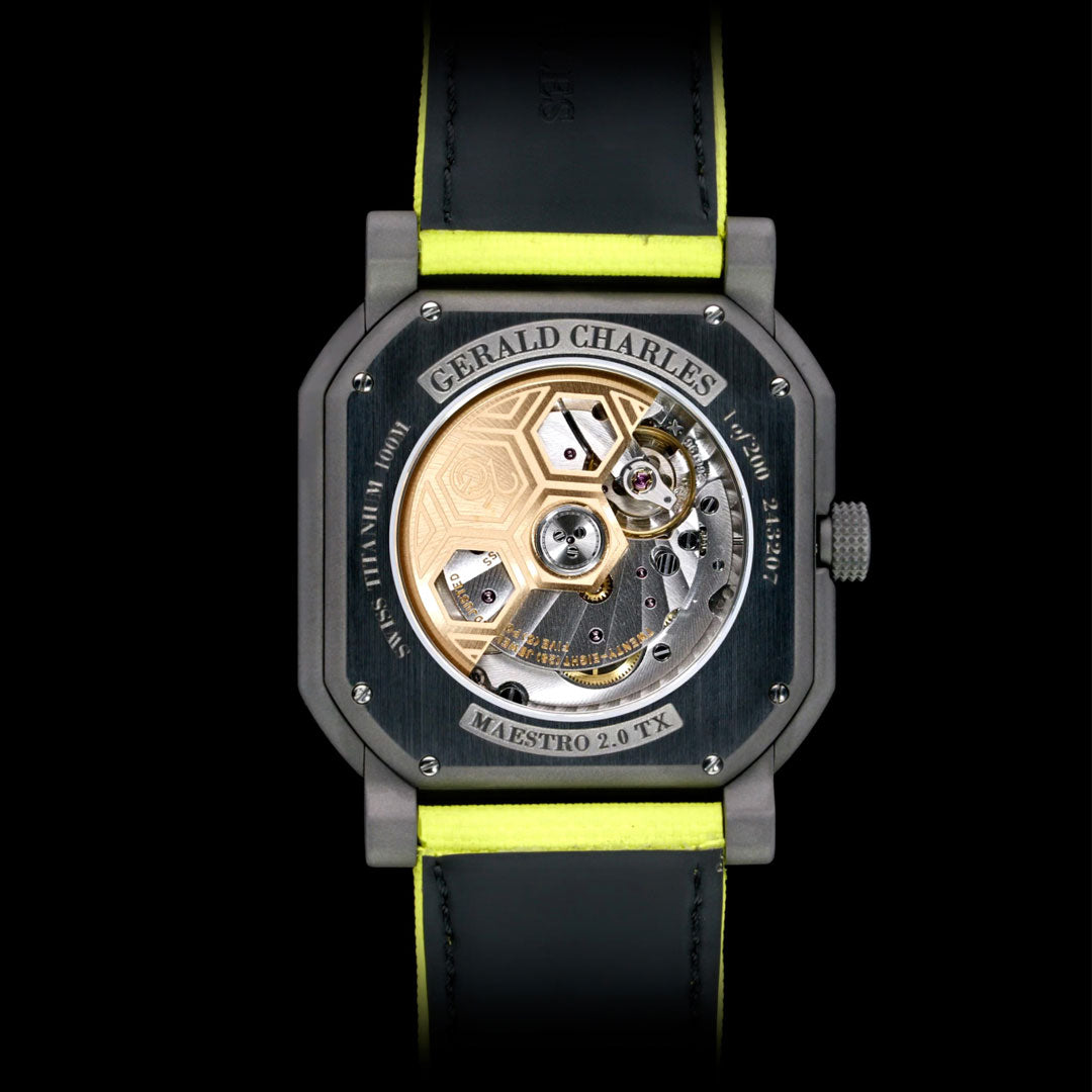 Az óra üvegbetétes hátlapja mögött a Vaucher Manufature Fleurier álatal gyártott, és a Maestro GC Sport kollekcióhoz testreszabott Calibre GCA 3002 automata szerkezetet találjuk. 4 Hz-es frekvencia mellett 50 óra járástartalékot kínál. Díszítését a márkától megszokott, spirális genfi csíkozás uralja és egy arany, hexagon mintás rotor teszi teljessé.