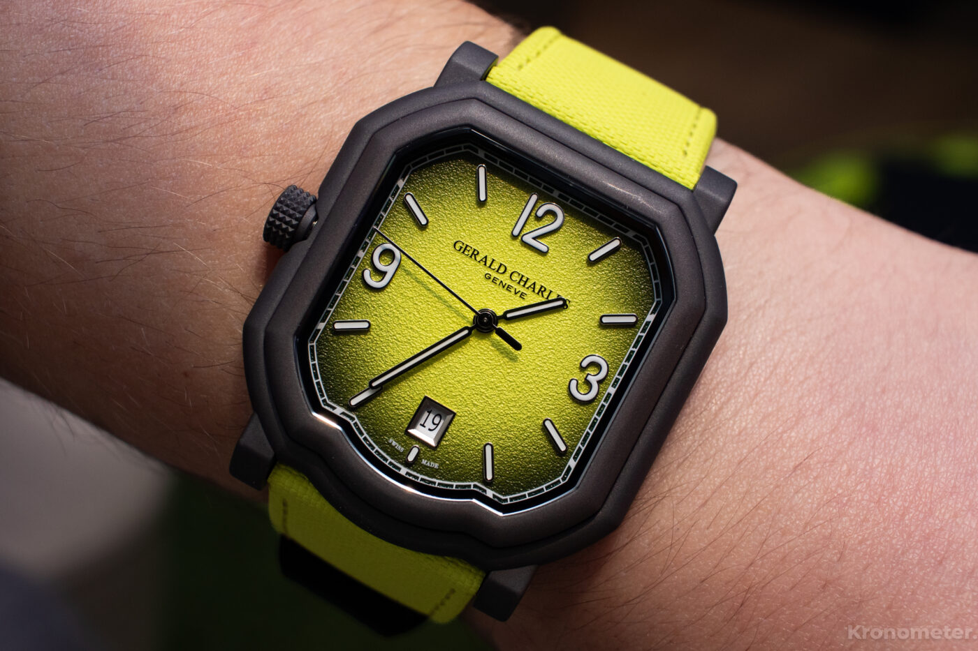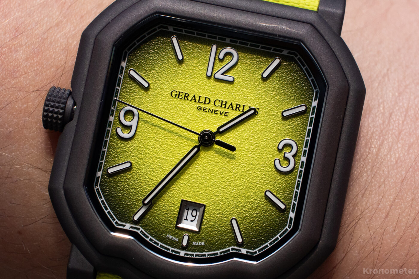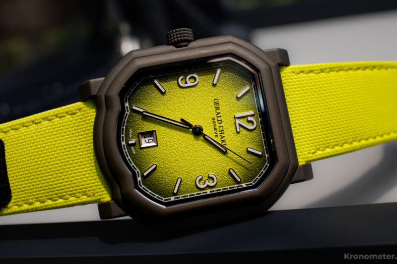 A belülről kifelé sötétedő, ombre számlapjának színe és textúrája is teniszlabdára emlékezetet. Ez is követi a tokformát, a karcálló zafírkristállyal együtt. Egészen a számlap szélén egy vasútsín stílusú, nyomtatott percskálát találunk, míg beljebb váltakozó, arab számok és pálcika indexek biztosítanak könnyű leolvashatóságot, fehér Super-LumiNova foszforeszkáló betétekkel. 12 óránál finoman dombornyomott a Gerald Charles logó, 6 óránál pedig egy hangsúlyosabb keret emeli ki a fehér alapon fekete dátumablakot.