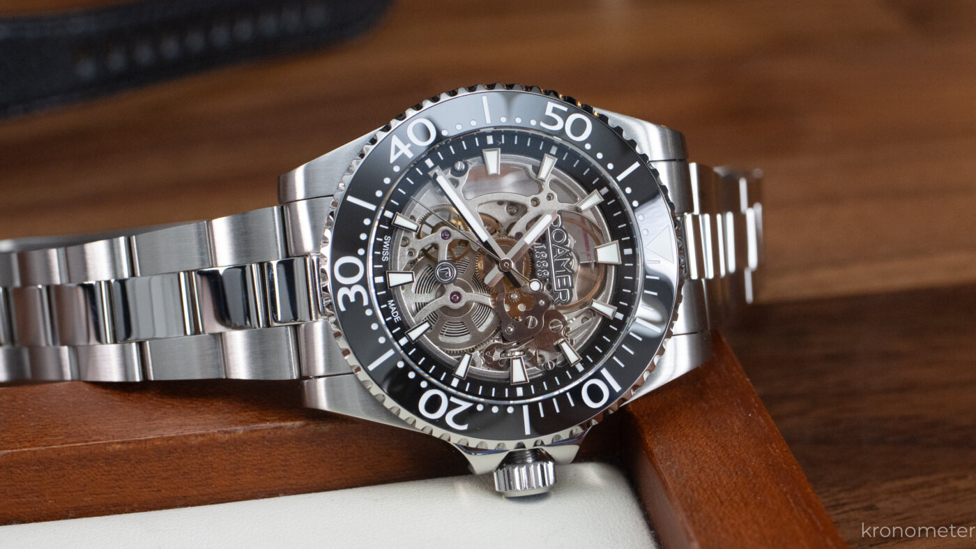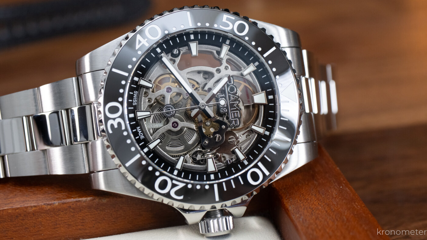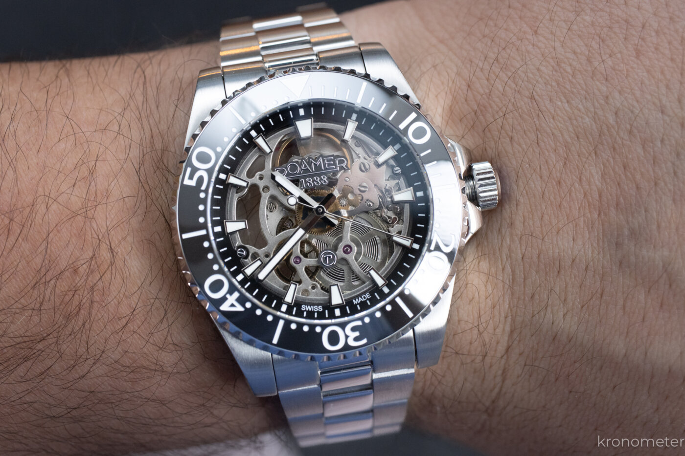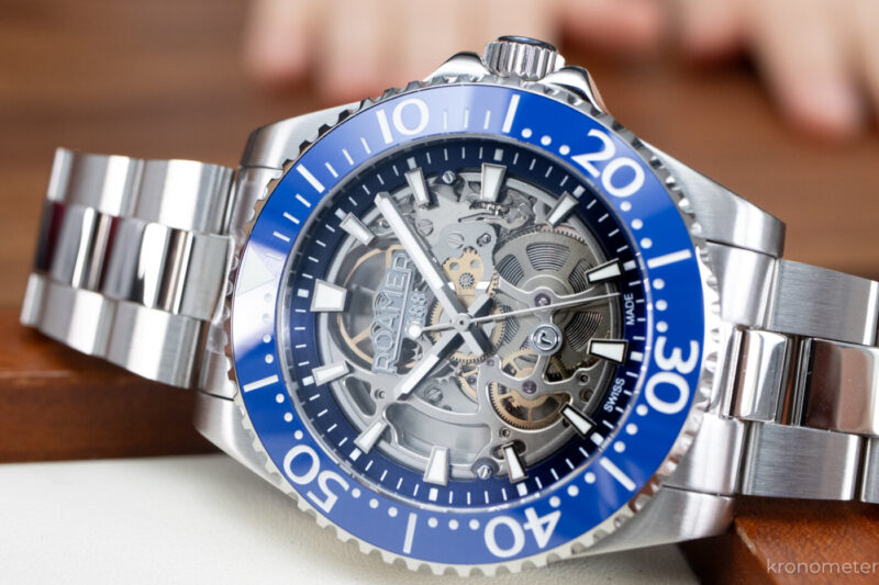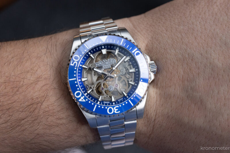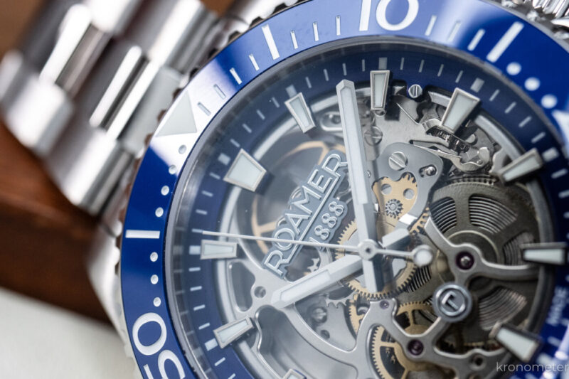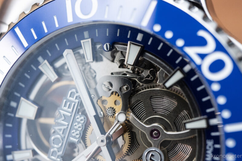 A lünetta a megszokott egy irányba forgatható, 120 klikkes búvárlünetta, ami kék és fekete színben is kellemes fénytörésű kerámiabetétet kapott. A tipográfia talán egy kicsit tolakodó, a számok eggyel nagyobbak és vastagabbak a megszokottól, de nem lehet, sőt nem is kell minden kerámialünettának ugyanolyannak lennie! A lényeg nyilván a zafírüveg alatt van. Ami kifejezetten jól sikerült, az a számlap kiképzése és az abból adódó térhatás. Az órajelölő indexek mintha a semmiben, a tok pereméről lógnának be, miközben a szerkezet felett egy leheletvékony, átlátszó üvegkorongon ül a Roamer logó. Ezzel elérték, hogy a látvány tényleg mély, háromdimenziós legyen, a Super-LumiNova festésnek hála pedig a mutatók és az indexek a nagy csontváz-kavalkádban is értelmezhetők maradnak.