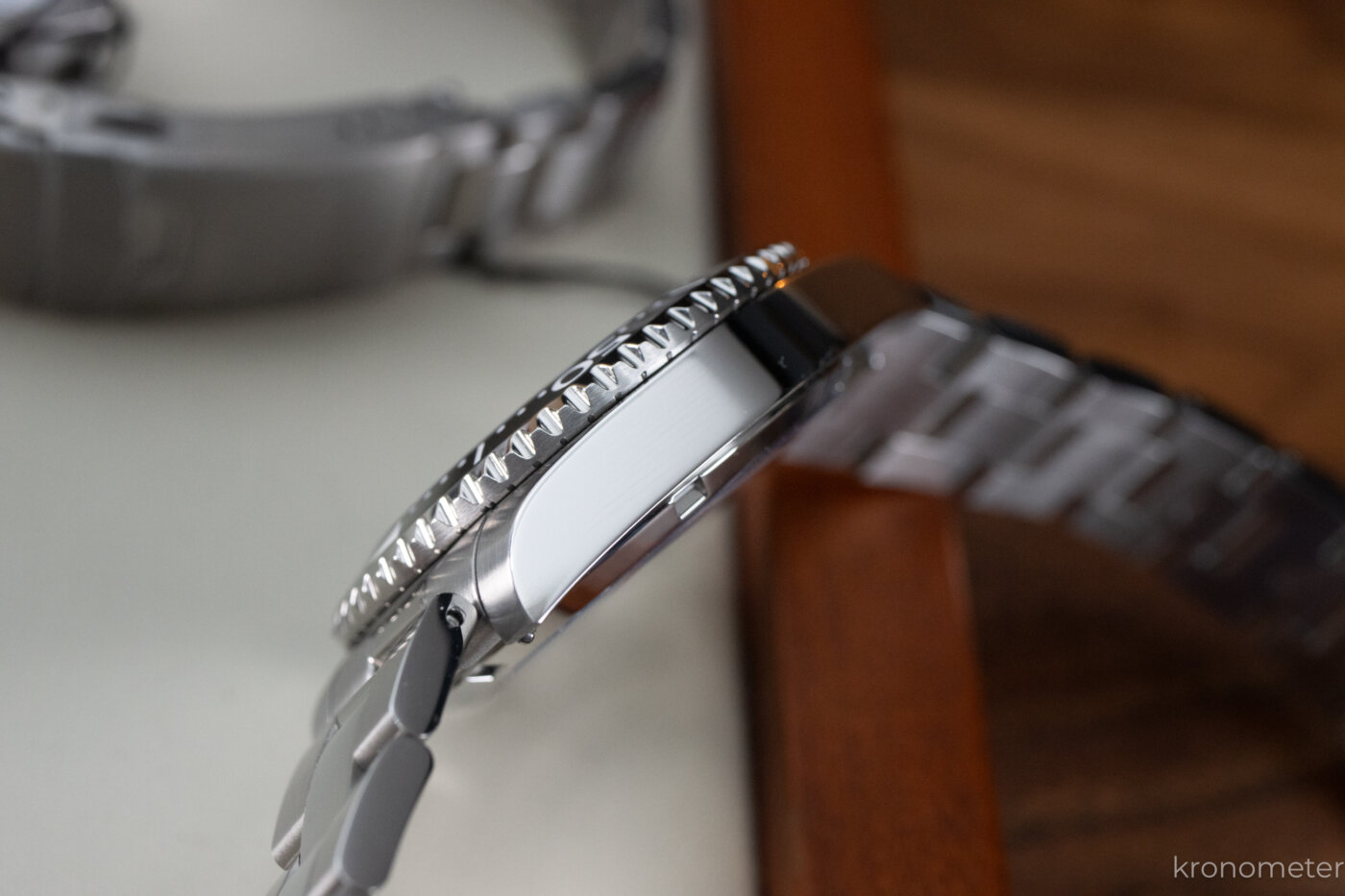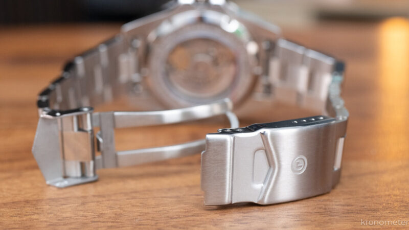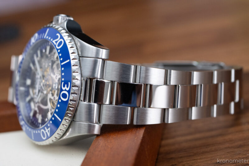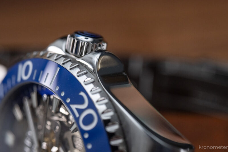 A formai inspiráció egyértelműen Rolex irányból érkezett. Ez a 42 milliméteres acéltok nagyon erős Submariner-génállománnyal rendelkezik, leginkább a korábbi „supercase” szélesebb vállú profiljára hajazva. Ugyanakkor az arányok élhetők, a kidolgozásba pedig nem nagyon lehet belekötni: a szálhúzott és polírozott felületek, a letörések rendben vannak, és természetesen megkapjuk a menetes koronát, valamint a tisztességes, 200 méteres vízállóságot is.