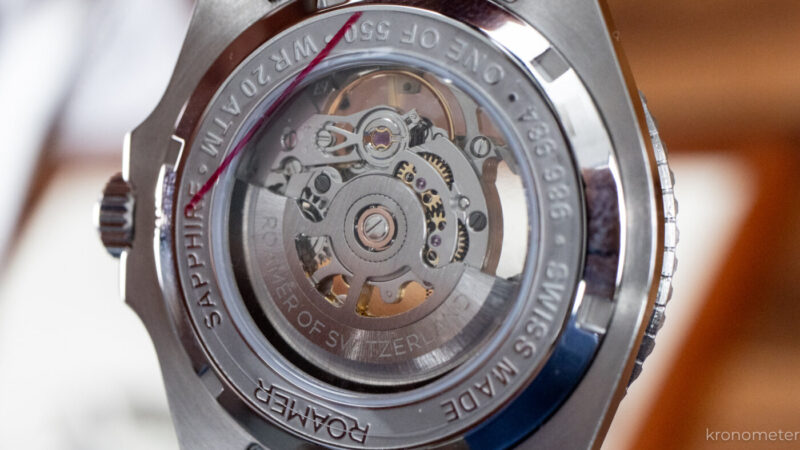 A Roamer nem egy tessék-lássék nyitott werkkel szúrta ki a szemünket, hanem egy kifejezetten szépen áttört Soprod P24-et tokozott. Látjuk a rugóházat, vizuálisan követhetjük, ahogy felhúzáskor változik a rugó tekercselése, és szinte a számlap síkjáig felkúszik a gátkerék, de ami órás szempontból a leginkább dicséretes: vették a fáradtságot, és egy tisztességes, dátum nélküli szotoárt (váltókar) raktak bele. Nincs az a bosszantó „fantom” dátumállás a koronán, kihúzva egyből a mutatókat állítjuk. Ez az az apró, de fontos odafigyelés, amit gyakran még drágább svájciak is kispórolnak.