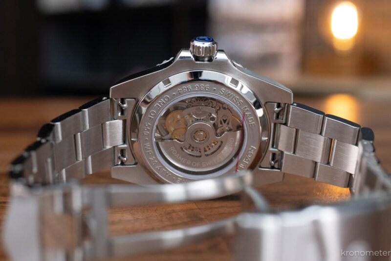 A 42 millis tokhoz egy masszív acélszíj csatlakozik – bár dobozon belül kapunk egy színben passzoló, gyorskioldós gumiszíjat is, ami nagy piros pont. A csat is vállalható ebben a kategóriában, de ha megnézzük, hogy egy-egy mikrobrand milyen minőségű csatot képes szerelni, akkor jogos elvárás kezd lenni a nagyobb svájci gyártók felé is – főleg egy olyan gyártó felé, mint a Roamer, ami számos neves svájci márka bérgyártója.
