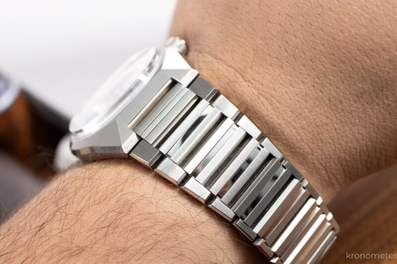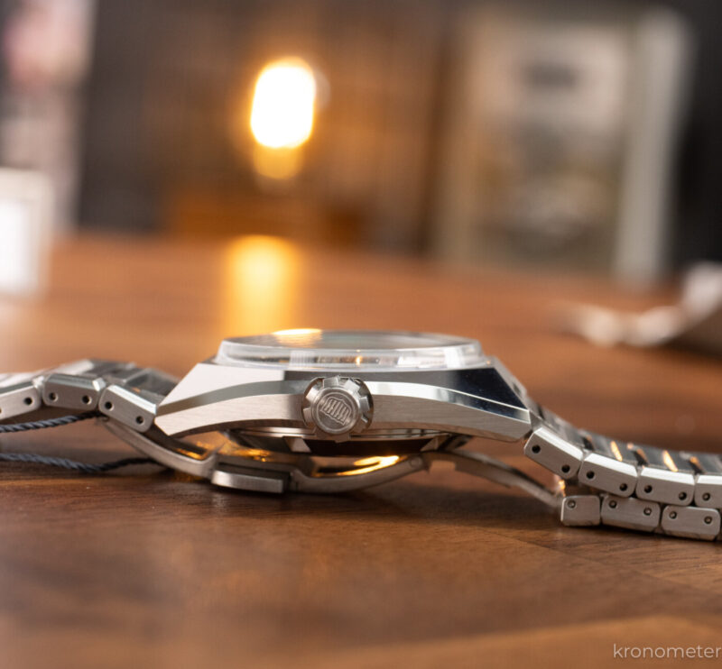 Megemelt zafírkristály zárja a 100 méterig vízálló tokot, ami így sportóráként, akár vízközebben is használható. A tok és a részletes acél csat egységet alkot, tökéletesen passzol a kettő egymáshoz. Míg a tok széles felületekkel dolgozik, addig a csat egészen vékony elemekből áll, ami így kényelmesen simul a csuklóhoz. Mindenütt polírozott és szálcsiszolt elemek váltják egymást, éles határokkal.