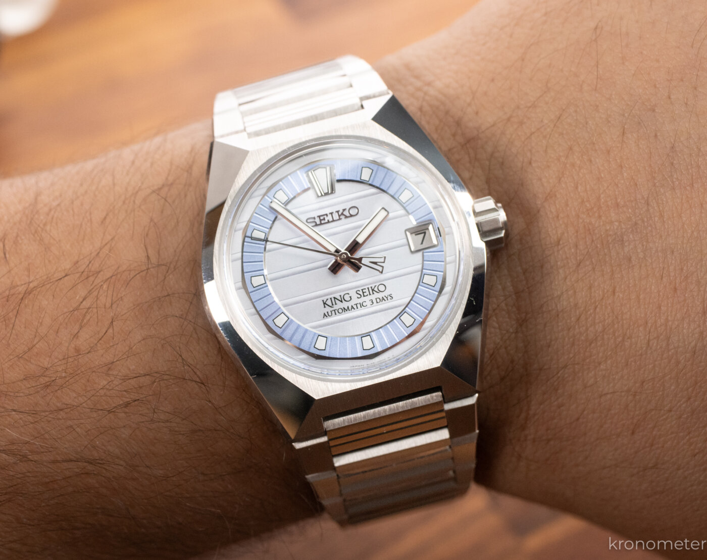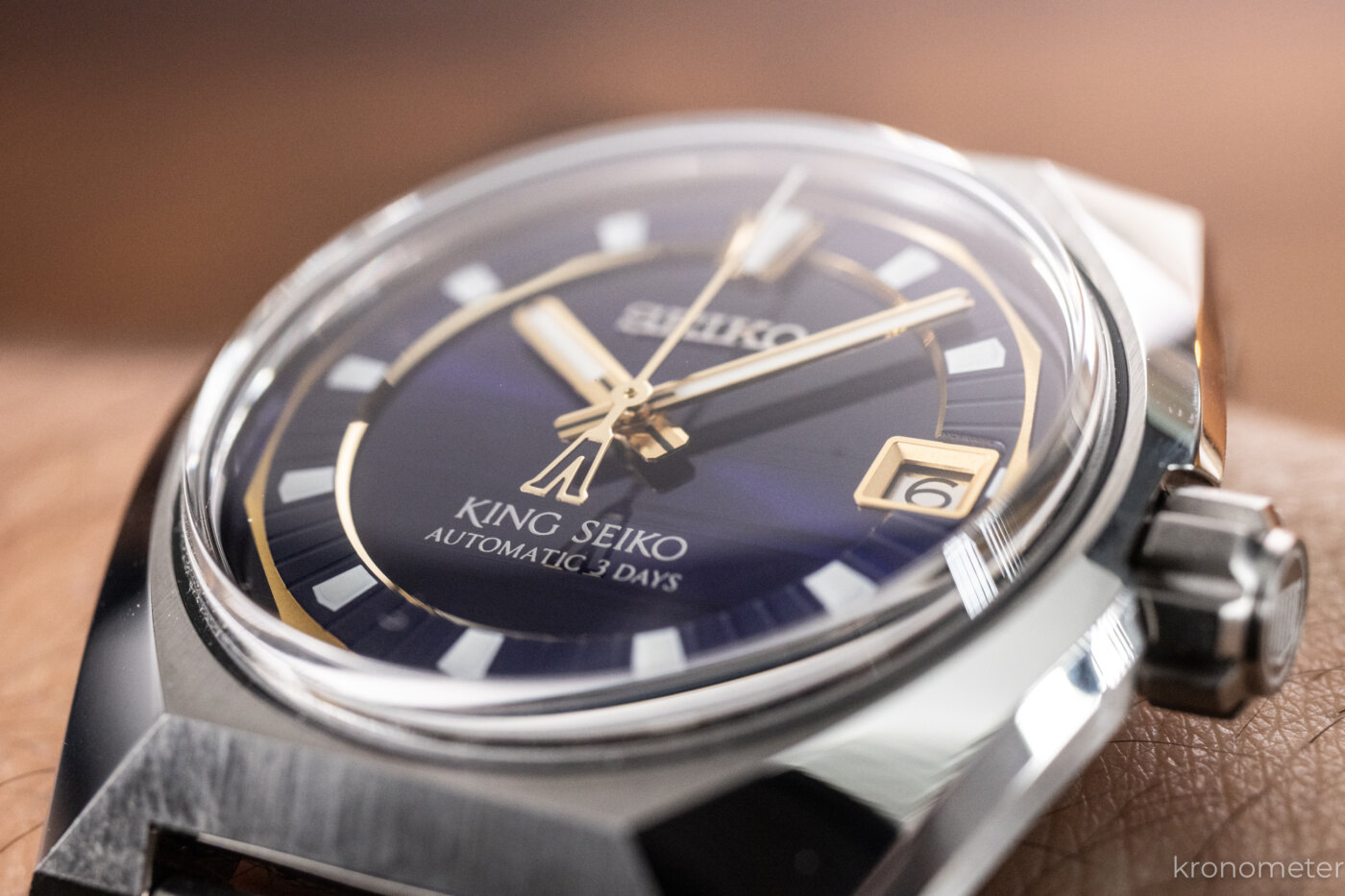 Az órajelölők barázdált külső ívét kívül szögletes perem határolja, áthidalva a tokforma és a kerek számlap közti teret. 3 óránál egészen a számlap szélére került a keretezett dátumablak. 12 óra alatt applikált Seiko logót, 6 óránál pedig nyomtatott King Seiko és „Automatic 3 Days” feliratot találunk. Utóbbi már-már túlzott közléskényszerrel utal a különleges szerkezetre.